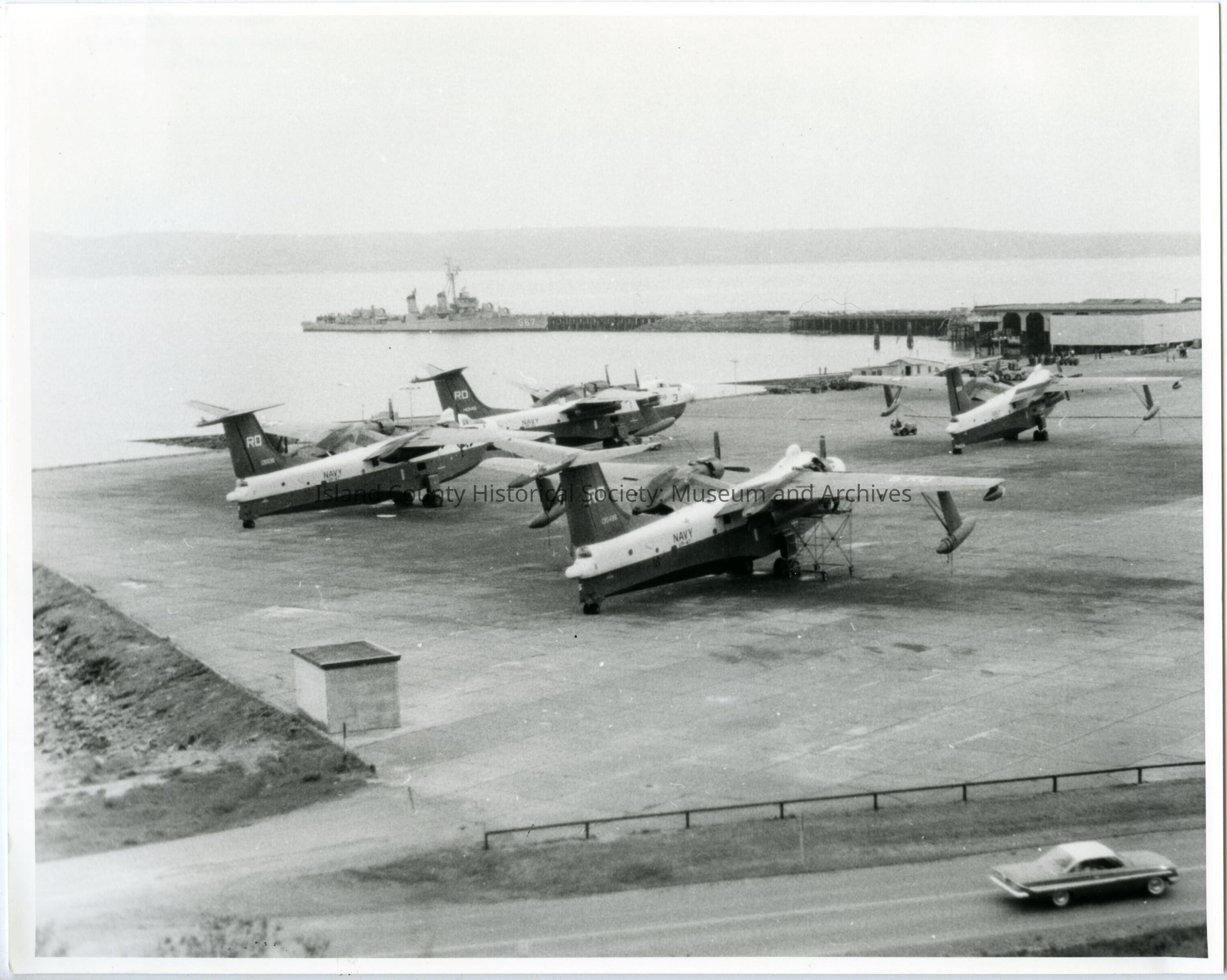 Photo of NAS Whidbey, 4 seaplanes parked on runway or maintenance area. Pier with Naval ship in the background. Might be the Seaplane Base in Oak Harbor. Car in lower right corner.