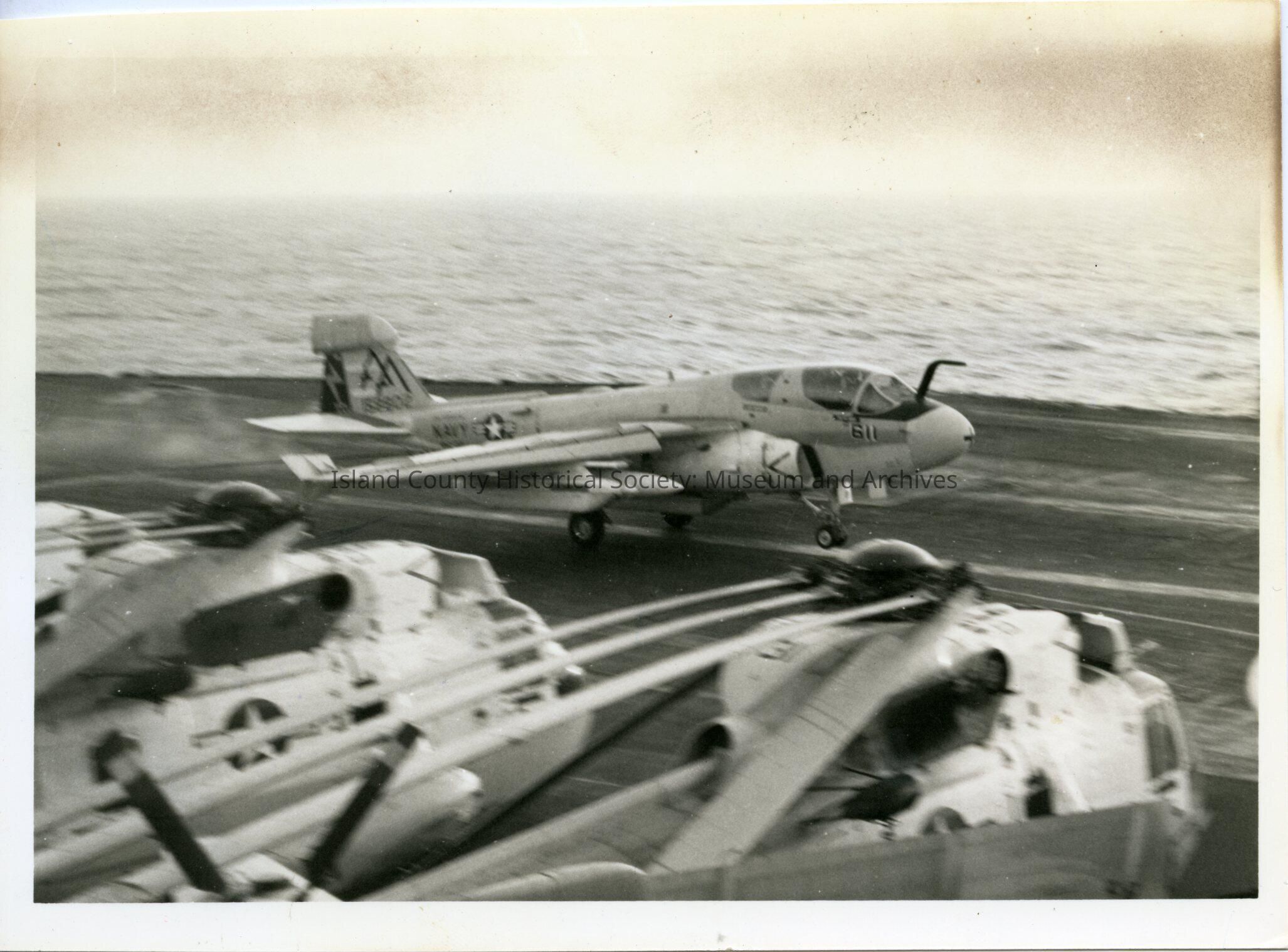 A photo of a Navy plane on the runway. Other Navy planes are in the foreground. Handwritten on the back is EA-6B Prowler, electronic warfare.