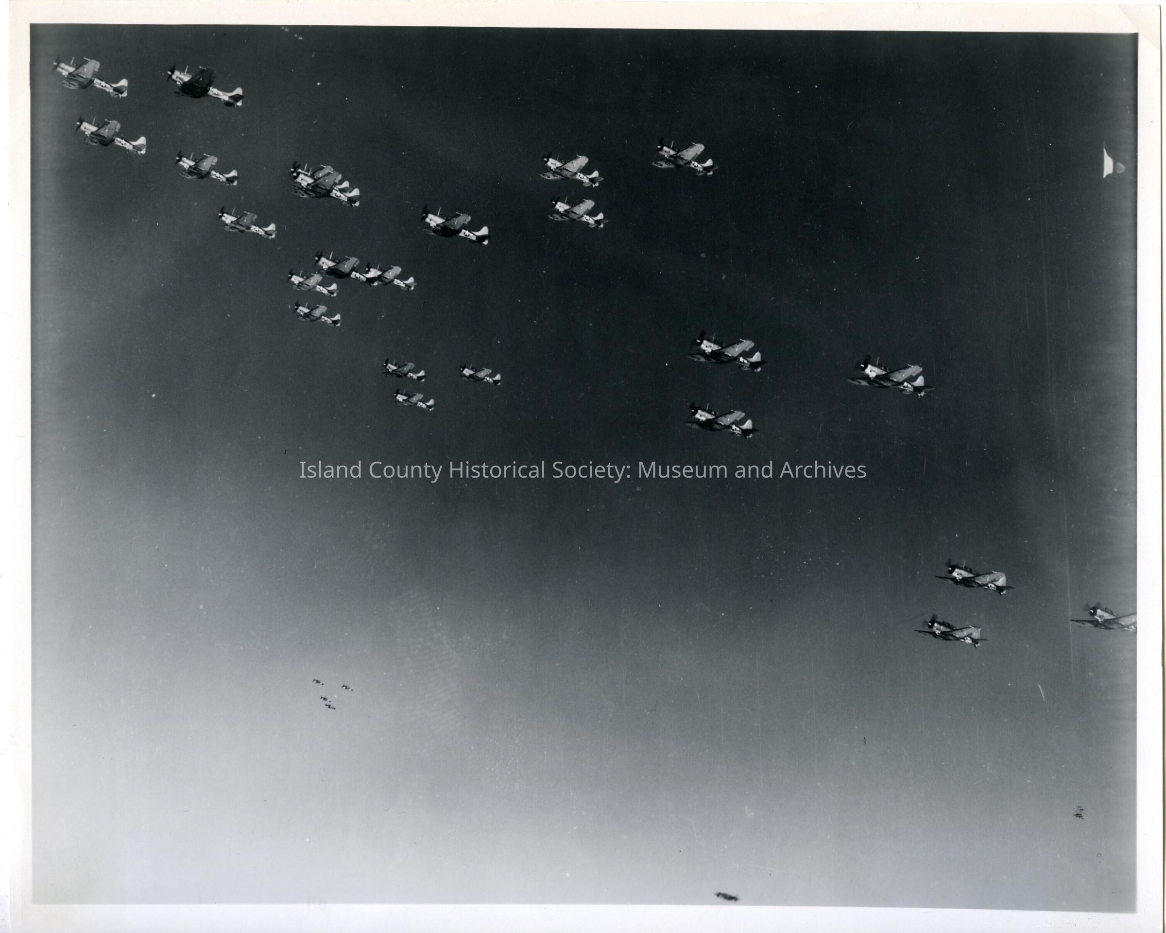 A photo of a row of Navy planes in the air. Typed on the back is "Air Group THREE Tactical Exercises. SBDs and TBMs over the Straits of Juan de Fuca west of Whidbey Island. January 9, 1944. Note Mount Baker in the background. NATIONAL ARCHIVES NEGATIVE NUMBER 80-G-356166."