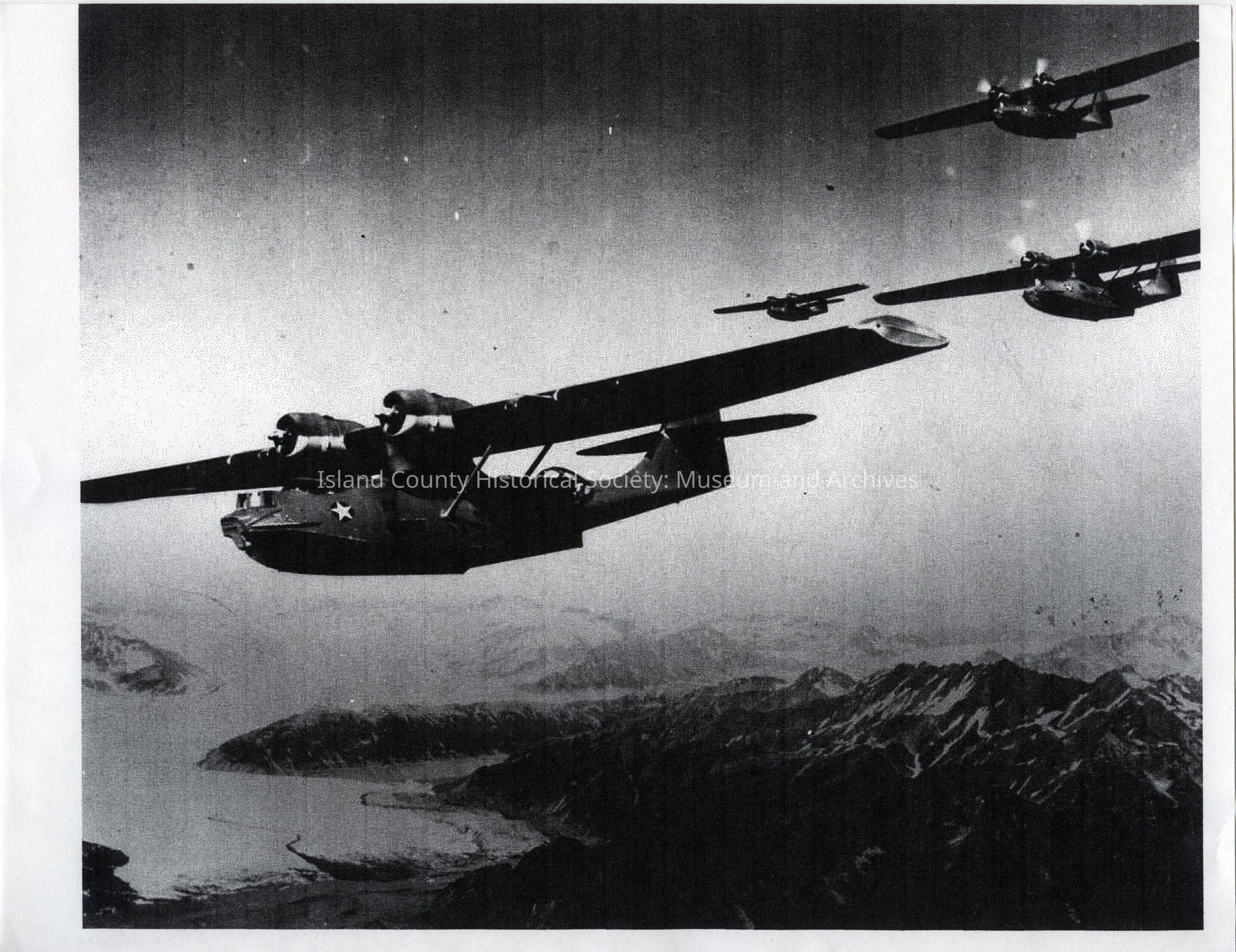A photo of a PBY Catalinas in the air, flying over mountains. Handwritten on the back is "PBY 5A Catalina over the Aku Team s."