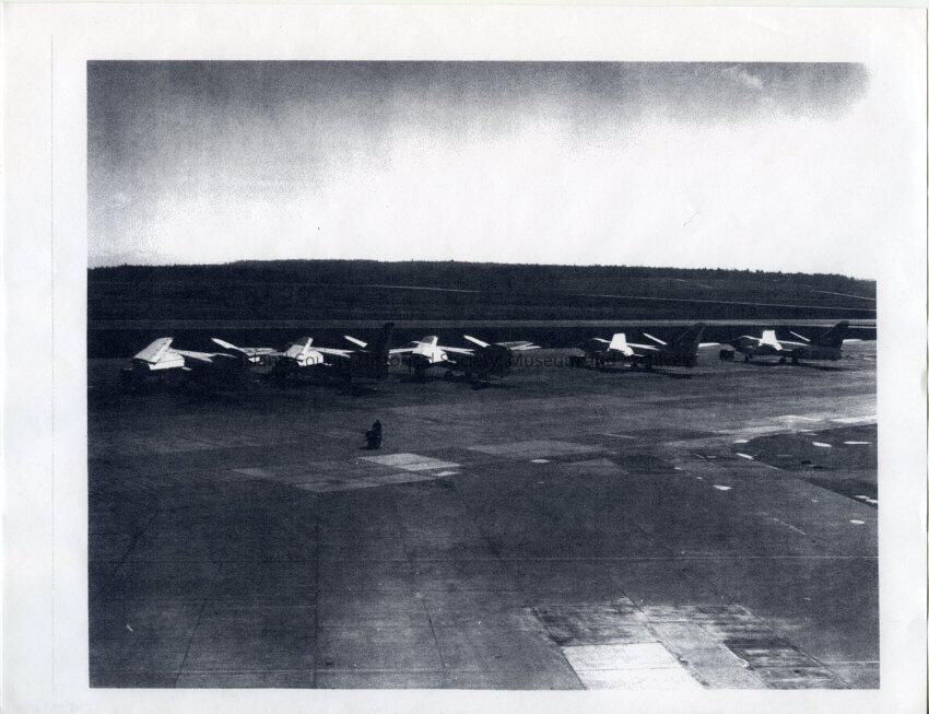 A photo of Navy planes in a row facing away from some flat place. There is a dark thing in the middle-left sice of the flat place. It appears there might be a building in front of the planes.