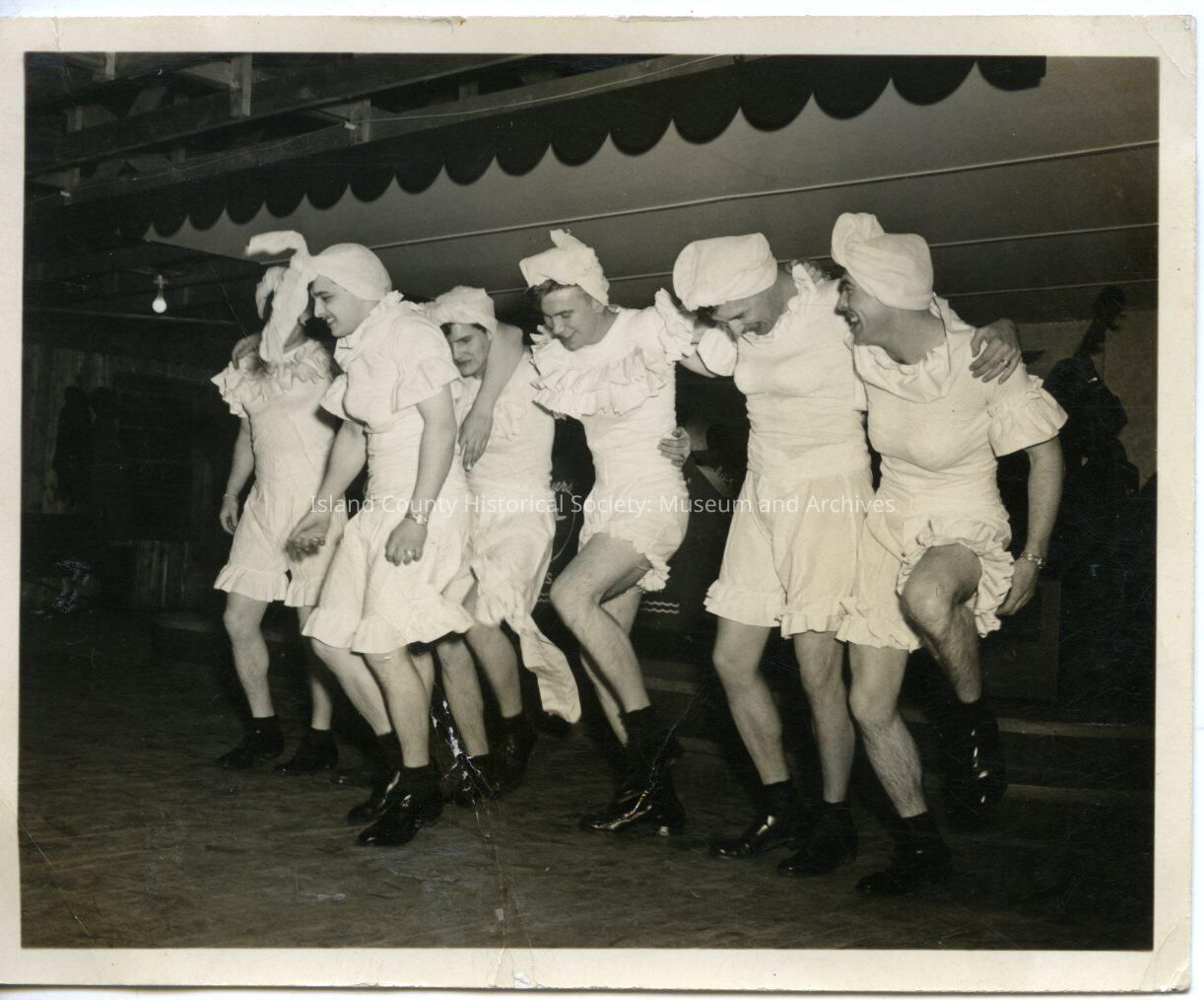 A photo of six men dressed in white ladies ? clothes. Dancing on a stage. They appear to be laughing.