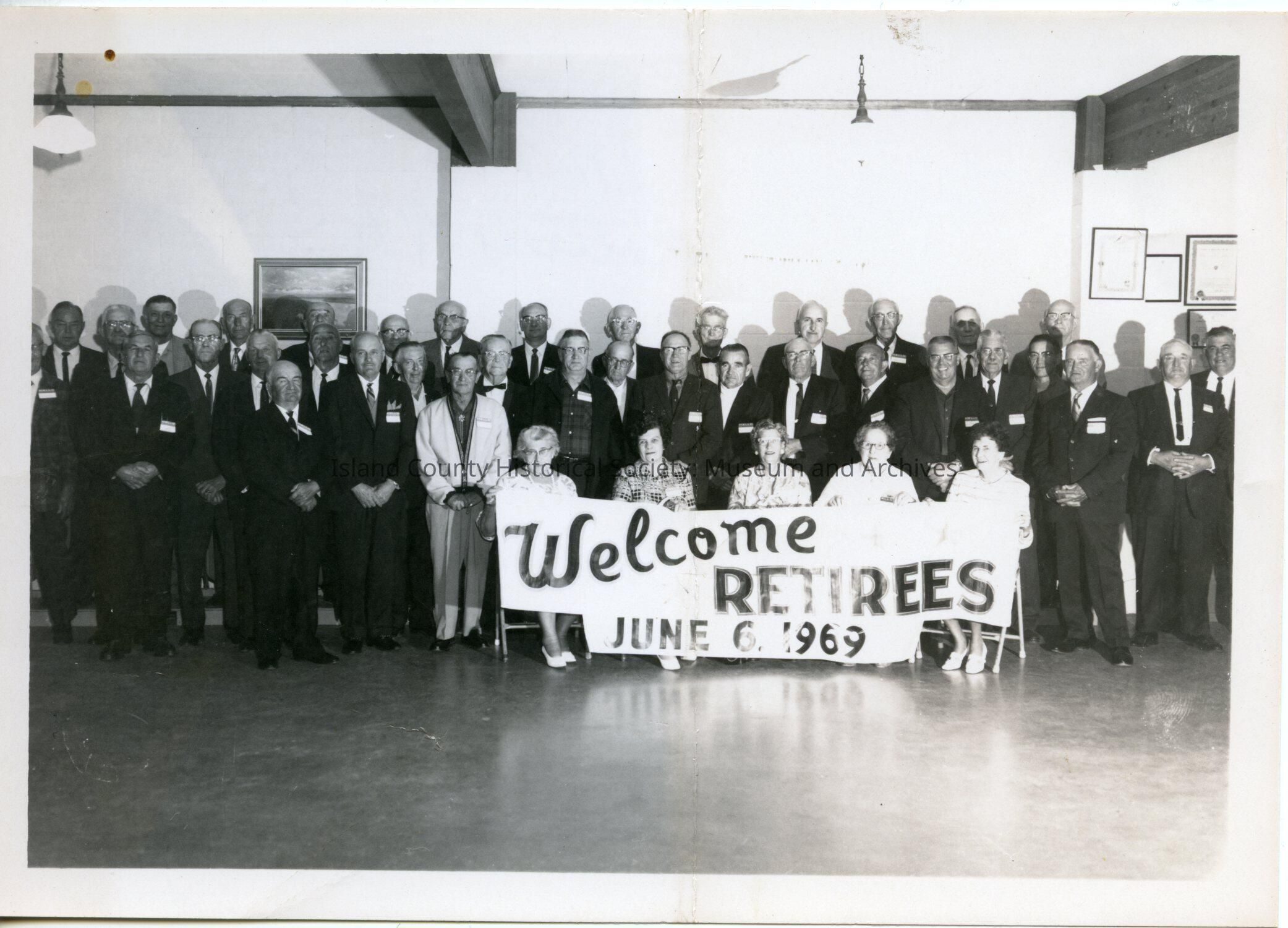 A photo of a group of people inside of a building. The people sitting in front of the crowd are holding a sign that says "Welcome Retirees June 6, 1969."