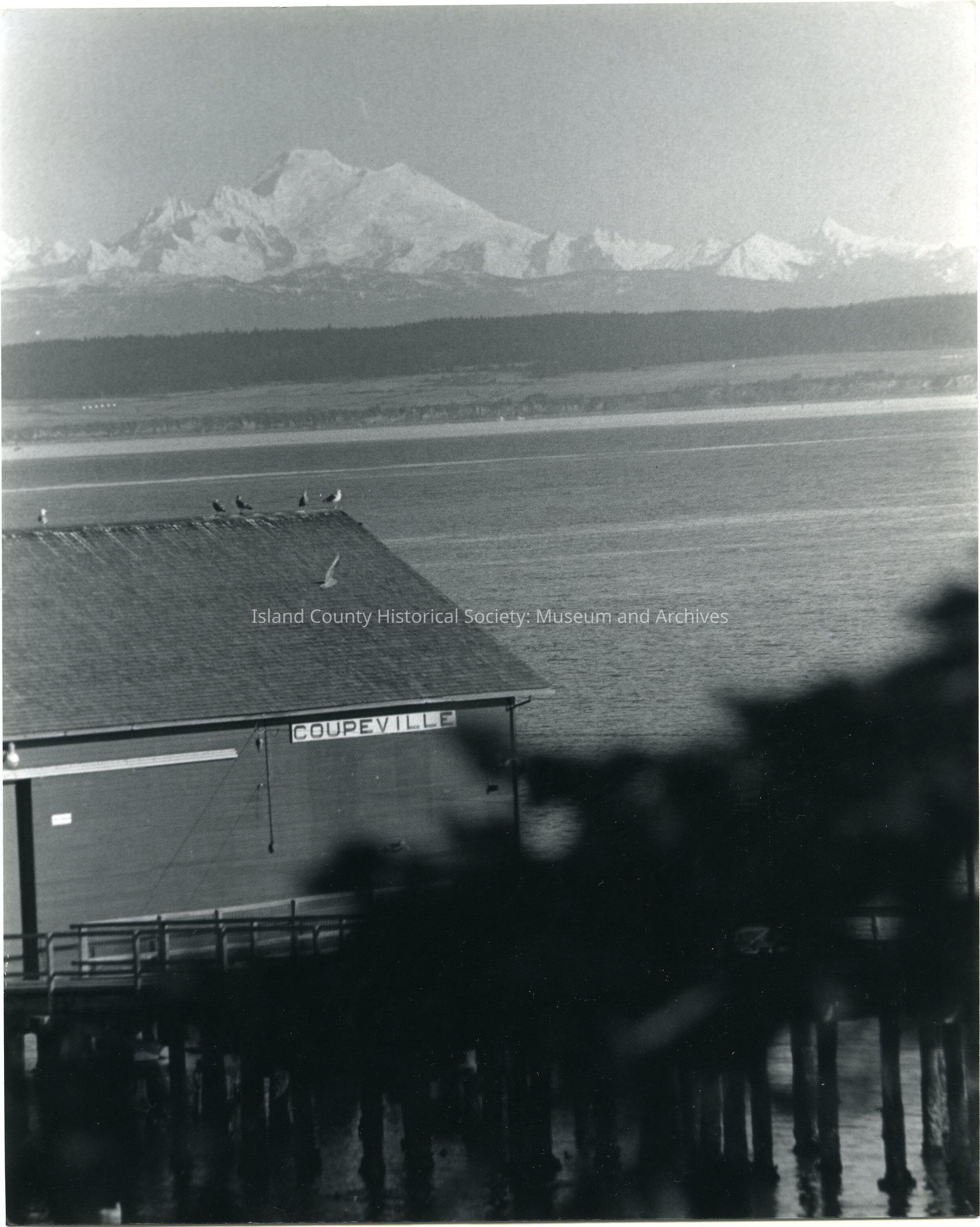 Photo of Coupeville Wharf looking east from the path beyond Front and Alexander Streets. Mt. Baker is in the distance. There are no windows and there might only be a sliding "garage" door in the front. Seagulls are on the roof. Sign: Coupeville - on the right.