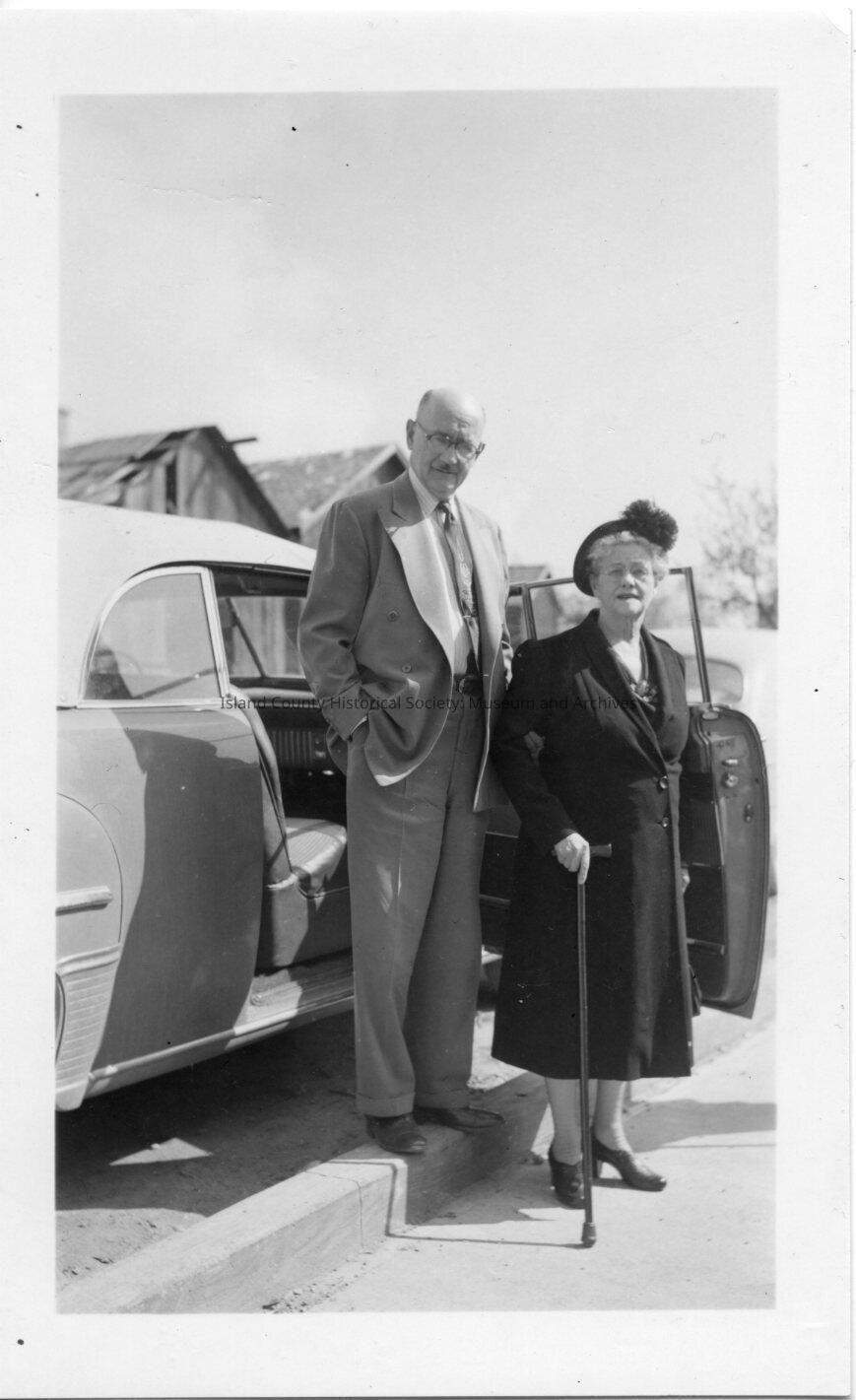 Black and white photo of Grandma Carskadden and Doctor Carskadden. On back: May 23, 1950. They are standing beside the passenger side of a car, front door is open. He is standing on a curb, she is standing below it. she is wearing a coat, hat and holding a cane in her right hand.Made/Created