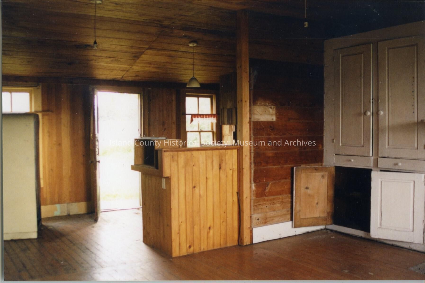 Inside view of Jacob Ebey House. Saltbox Residence. Wood frame set on wood post/concrete block foundation: rectangle (20'x32'). Image shows an inside view of the Ebey house. To the right of the photo one can see some white cabinets. To the right is a view on the kitchen.