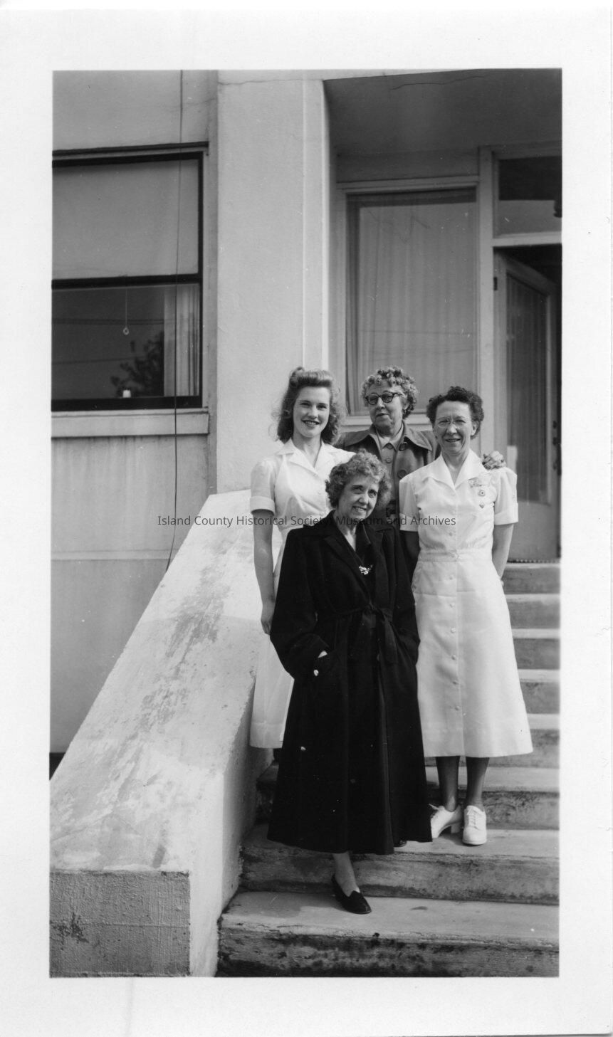 Black and white photo of 4 women, at least one is a nurse, on the steps of a building. Two women are wearing coats, at least one is wearing a nurse's uniform. The steps are concrete and wide and narrow, wide concrete wall beside the steps. Stamp on back: Jacobson's, Bellingham, WA Jun 14, 1950Made/Created