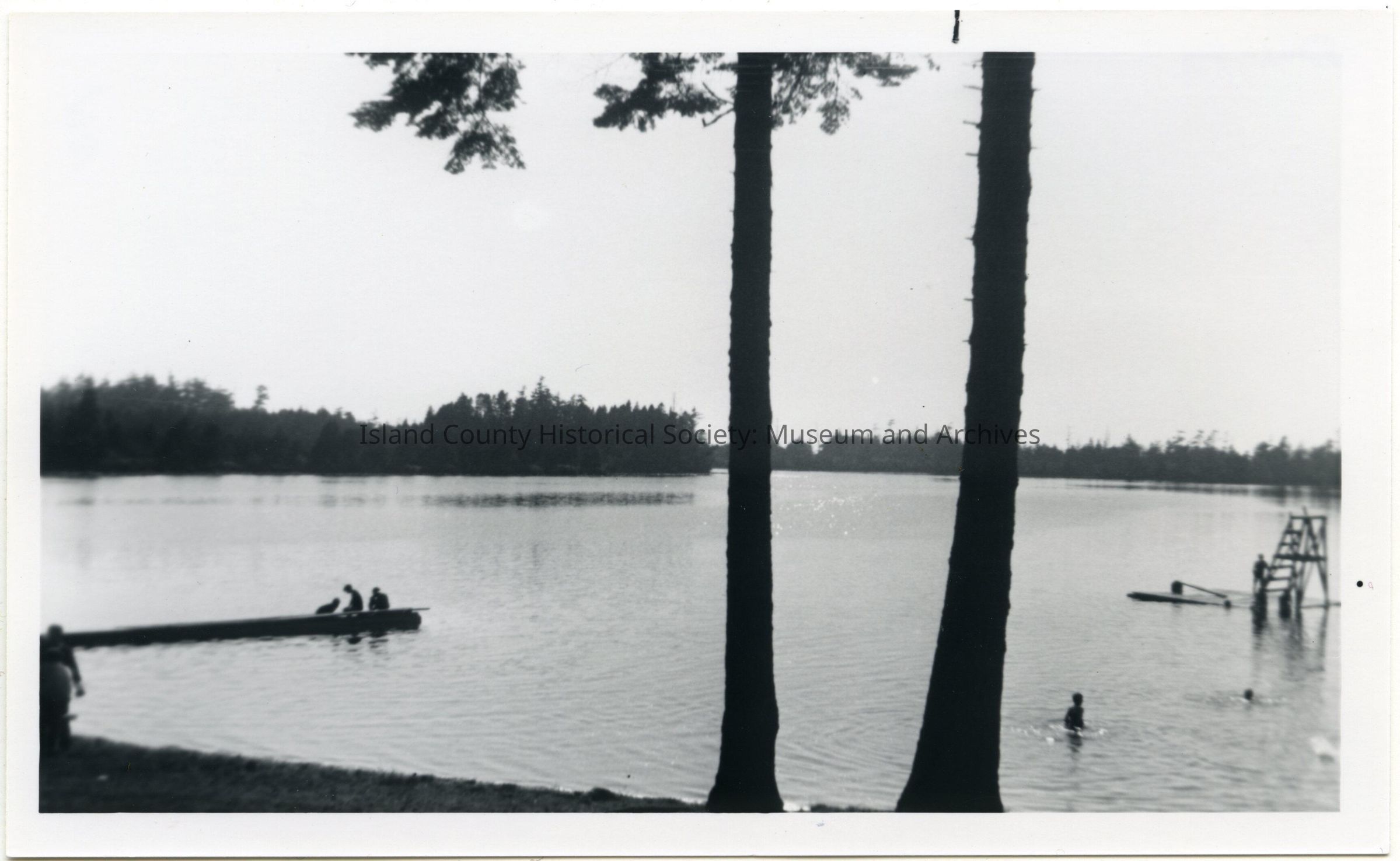Negative of Cranberry Lake. People are on the shore, on a wharf or dock, a diving platform and in the water. Two tall trees are in the foreground. The photo has 1931 on the back. From folder: Cranberry Lake