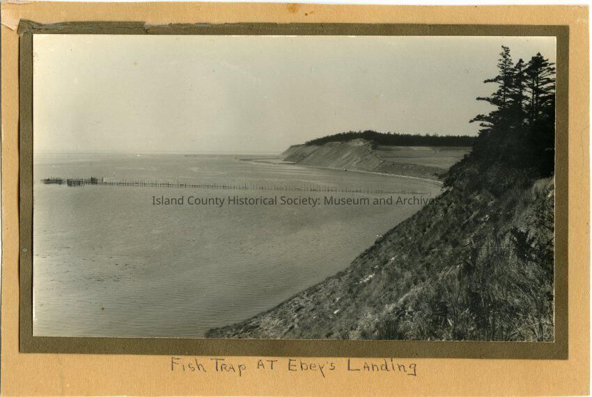 Photograph (mounted) of fish trap at Ebey's Landing. Perego lagoon is in the distance. Caption written on the front and on the back: fish trap at Ebey's Landing From folder: Ebey's Landing