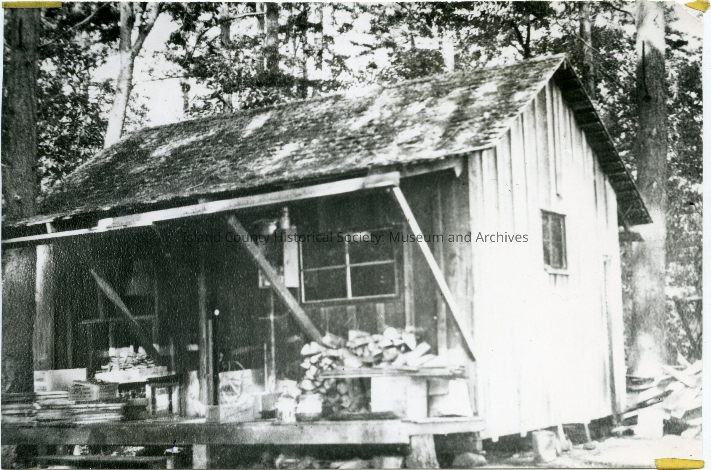 Photo of a small wood building built on wood pilings with a front porch. Firewood is stacked on the porch as well as various other items. Trees are behind the building.