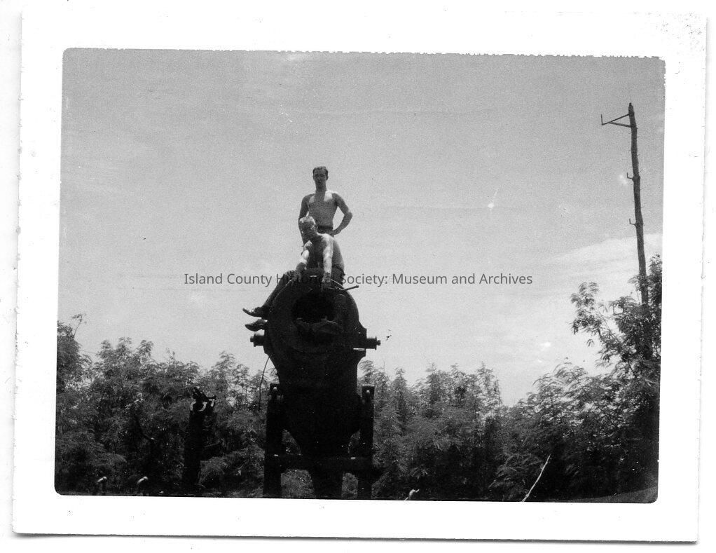 Polaroid black and white photograph of Fort Casey gun and two men. Written on back: "James Sutherland standing Ron Van Dyk pointing at gun breach Grande Island P.I. 3 oct, 1961"