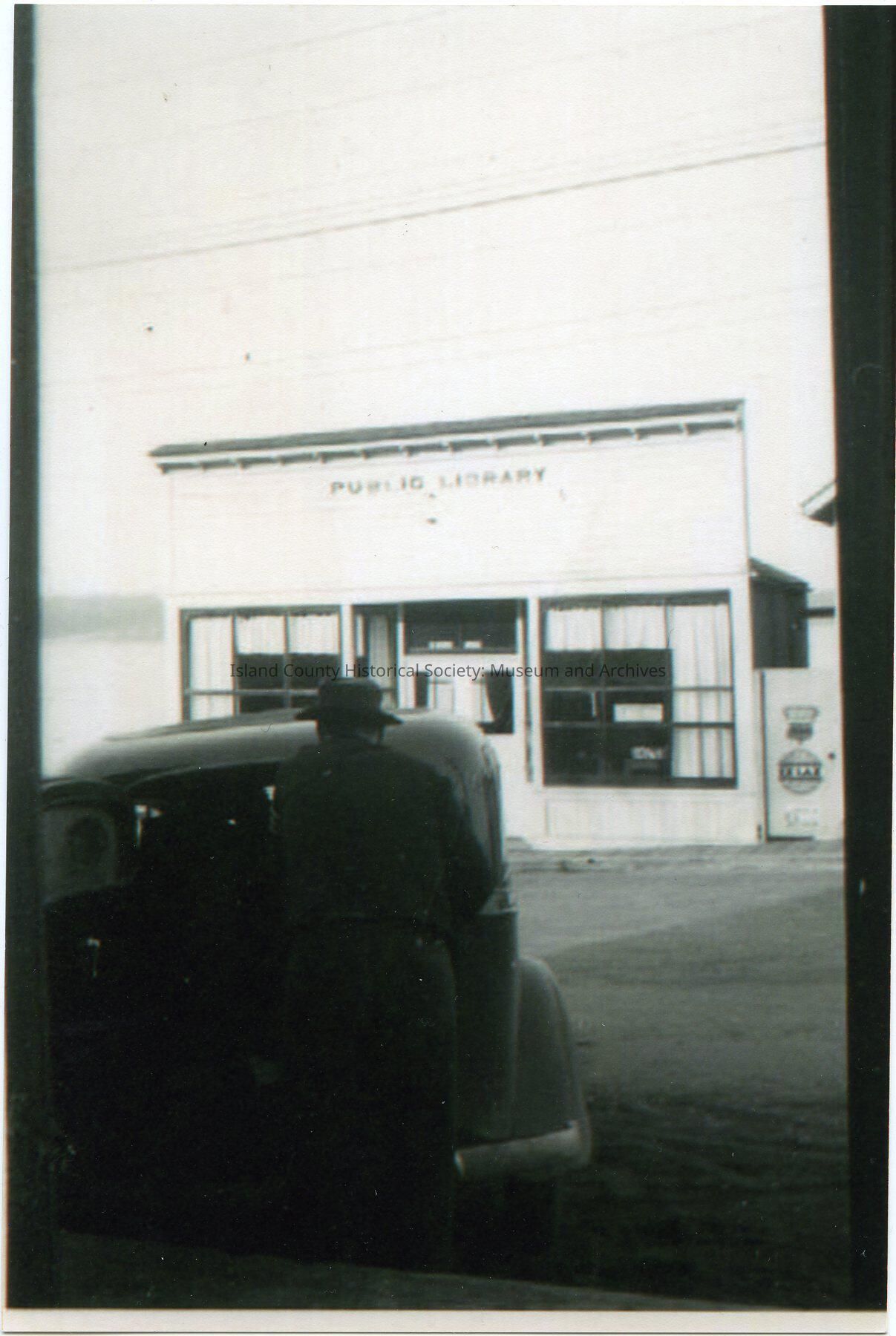 Photo of a man putting something in a car across Front Street from the Public Library. Per a note this is an unknown man loading cleaning into Ilah Engom's delivery vehicle. (She ran a dry cleaning business.) This is near the Glenwood Hotel.