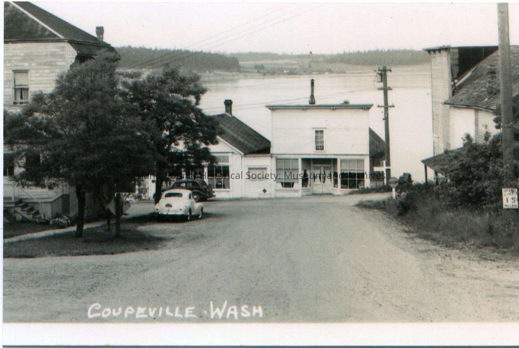 Photo looking north on Main Street to Front Street from the corner of Coveland. The Glenwood Hotel is on the left, other shops are in front and the theater is on the right. Sign for Speed Limit 15mph on right. Cars on Main and Front Streets. Caption: Coupeville, Wash.