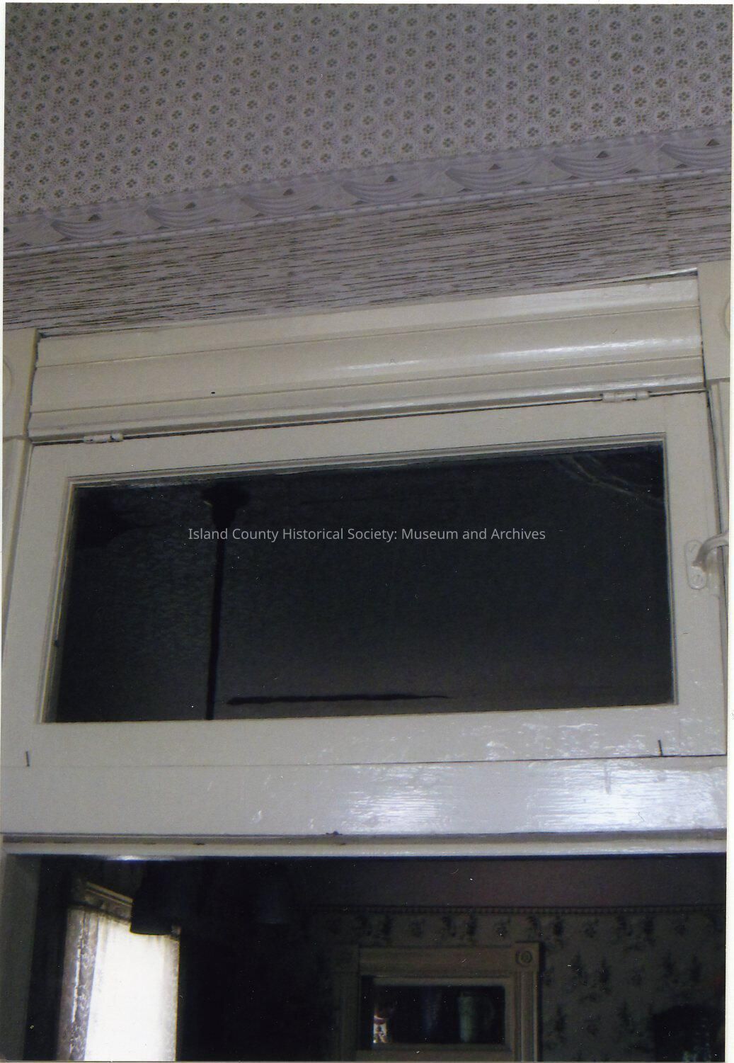 Photo of the interior of a building - probably the Glenwood Hotel since this was in the folder. In the center is a transom. The door frame at the bottom has cornices. A sheer curtain is in the window.