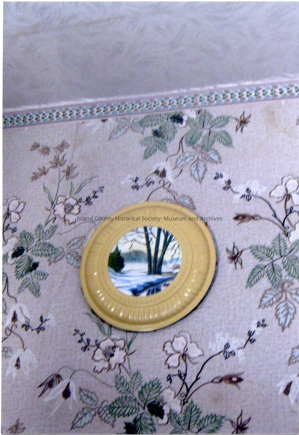 Photo of the interior of a building - probably the Glenwood Hotel since this was in the folder. In the center is a round wallhanging with a painted scene of trees, bush, creek and snow. It is hanging on a wall with flowered wallpaper.