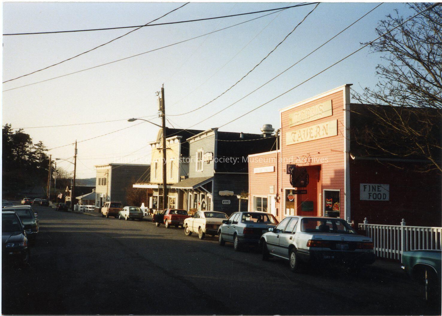 Photo of 8 NW Front Street with a sign along the top of the false front: Toby'sTavern. Cars are parked on both sides of Front Street. Another sign is ovver the doorway. A sign - Fine Food - is on the right side of the tavern. Whidbey Mercantile, A. B. Coates and Co., Coupeville Grocery Store, Cash and Carry, Sealey's Tavern, Toby's Tavern. On the back: Toby's Tavern