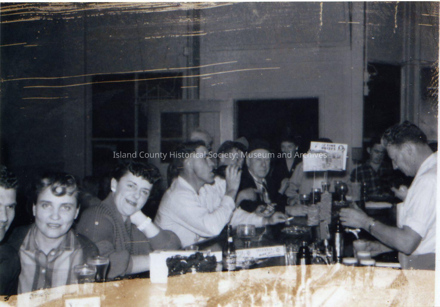 Photo of a group of people in a bar or tavern. This is 8 NW Front Street - at the time it was Sealey's Tavern. A man is behind the bar serivng drinks. On the back: Sealey (right).