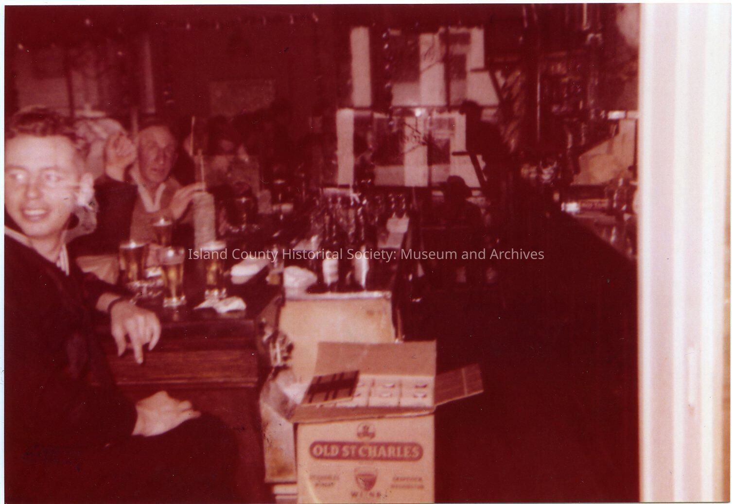 Photo of a group of people in a bar or tavern. This is 8 NW Front Street - at the time it was Sealey's Tavern. On the back: Vic Sealey's tavern.