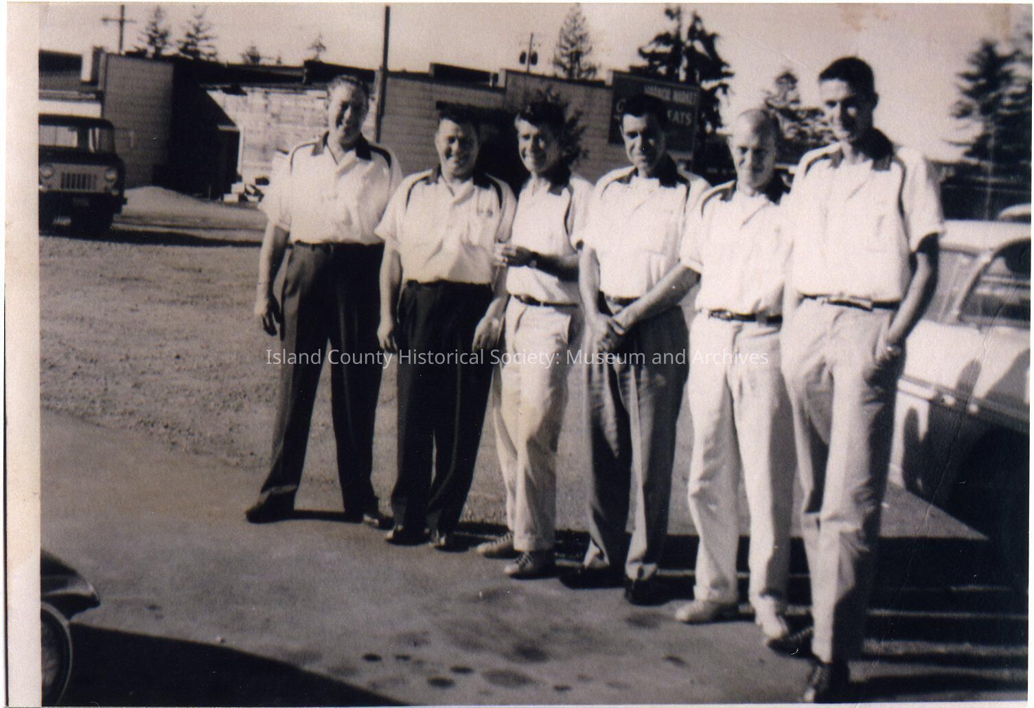 Photo of a group of 6 men wearing trousers and the same style/pattern shirt. They are standing outside in probably a parking lot. A low buidling is behind them. A sign in the center back is ..Market ...Eats. On the back: from left - Dave Wells, 2 from right - Ray Menters, 2 from left - Lyle Smith, left - Vic Sealey. Bowling Group. The copy was made on June 22, 2010. Vic owned Sealey's Tavern at 8 NW Front Street.