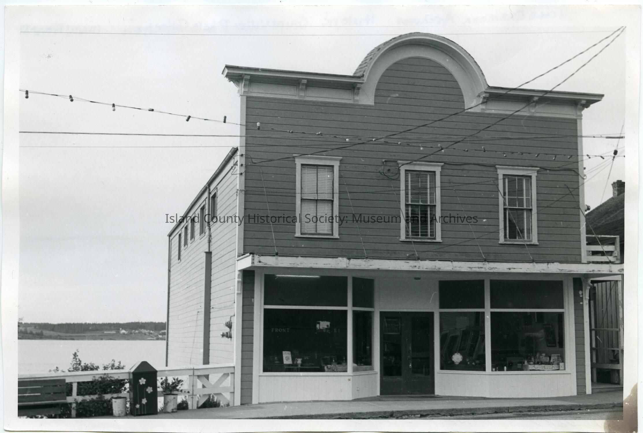 Per PNRO page 157: built 1886 by J. J. Straub. He used the lower portion as a wagon shop. Blowers and Kineth leased it in 1889 as the Coupeville Cash Store. Groceries until 1952 when it was the Coupeville Pharmacy. In 1959 an antique store. Extensive interior changes but exterior essentially intact.