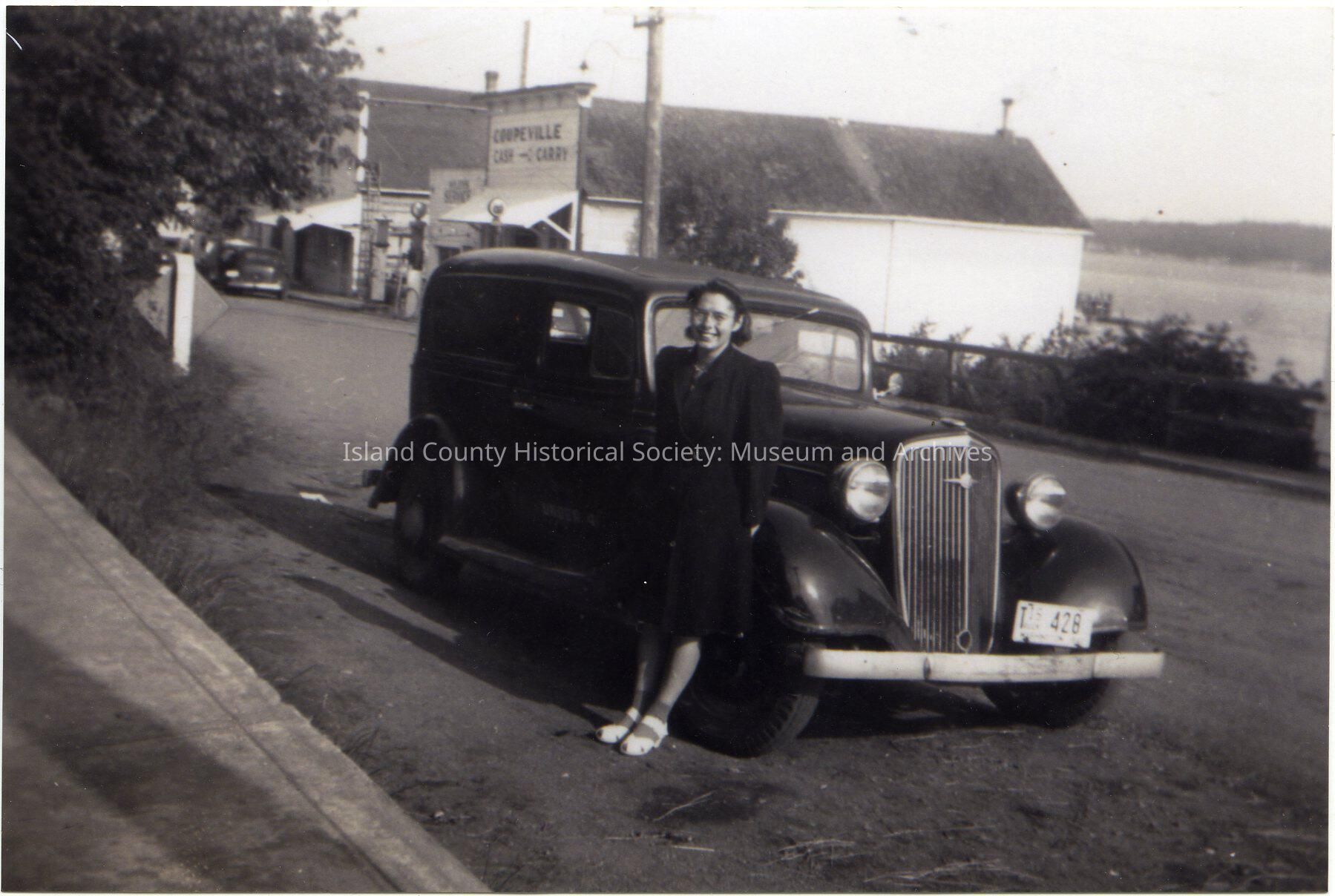 Photo of a woman leaning against the passenger side of a car on Front Street. Behind her is a building on the cove-side with a sign on the front: Coupeville Cash and Carry with two gas pumps just beyond the building.