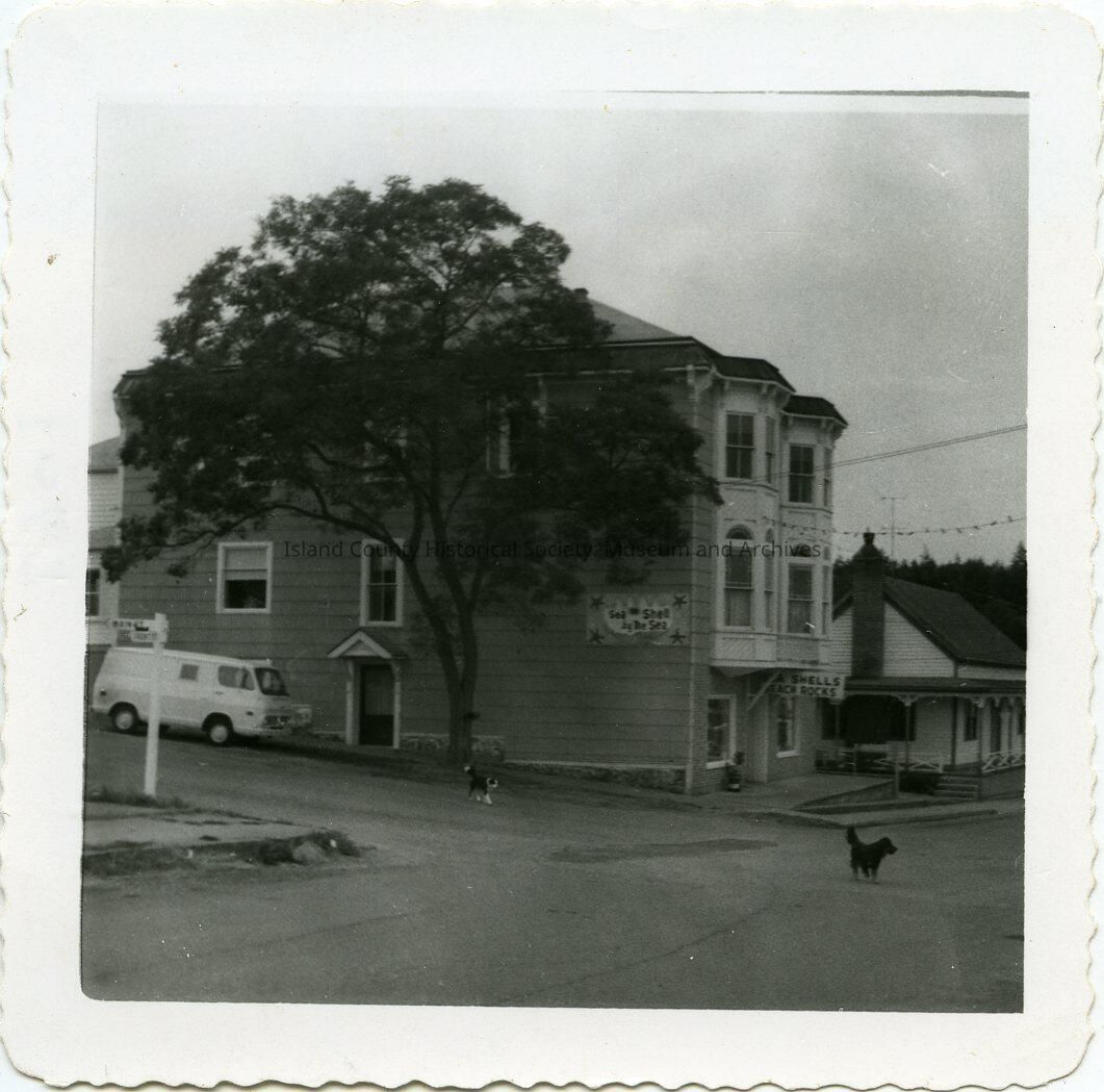 Photo of the side of the Glenwood Hotel (now lawyer's office). It is along Main Street and faces Front Street and Penn Cove. It is a 3-story building with bay windows on the top two levels in front. A van is parked beside it on Main Street. Two dogs are walking across the intersection. Sign at the front door: Sea shell, beach rocks.