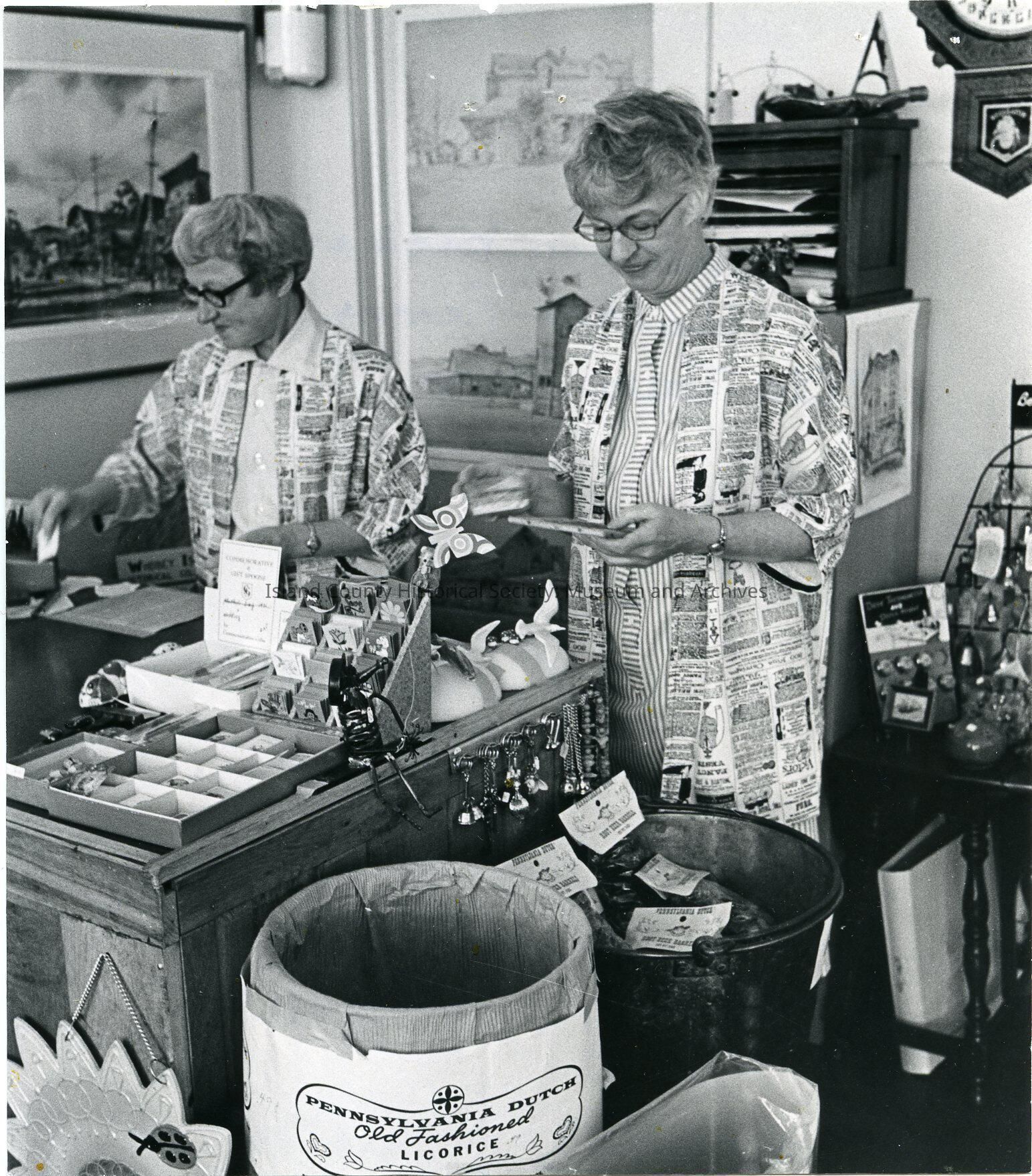 Photo of two women inside a shop. They are wearing dresses with an overcoat of material with ads from a newspaper or old catalog. Various items are on display or on the walls, including cards and Pennsylvania Dutch Of Fashioned Licorice in a barrel and in packages. The store is at the end of Main Street on the Front Street, Penn Cove side. On the back: July 30, 1972, Mickey Becker, Holace Perry "Old Town Shop", Coupeville, WN. (A blue 4 is in a circle.)