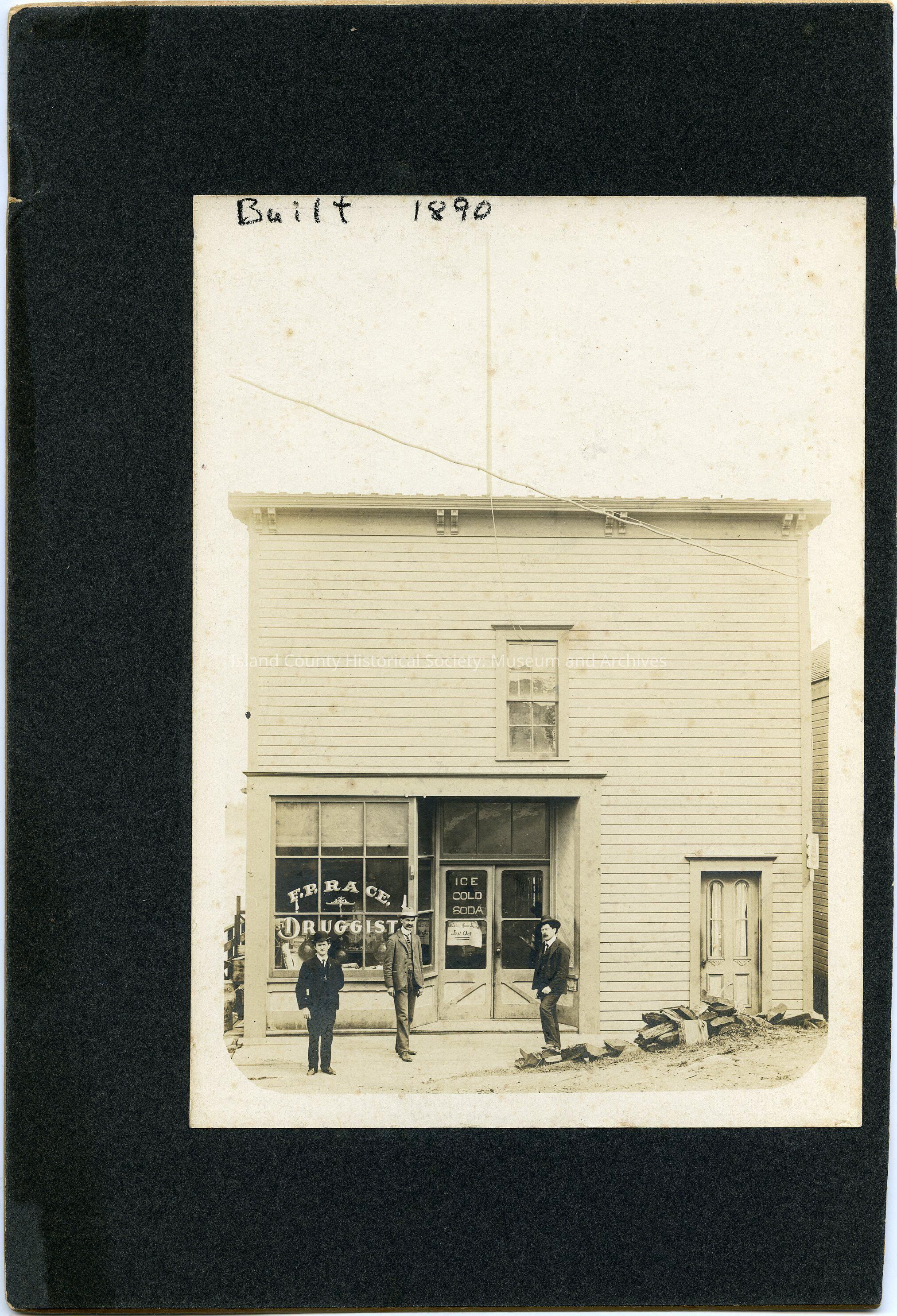 Photo of F. B. Drug Store - painted on the window: F. B. Race Druggist. Three men are standing outside the store. There is a central window on the second floor. One large window on the ground floor and the left with a double door - the right side is closed with a door. Wood sidewalk. On the photo is written: Built 1890. The store is at the end of Main Street on the Front Street, Penn Cove side. On the back: Drug Store of F. Puget Race, page #135, Built 1890. also: p106 #2, 1 of 3