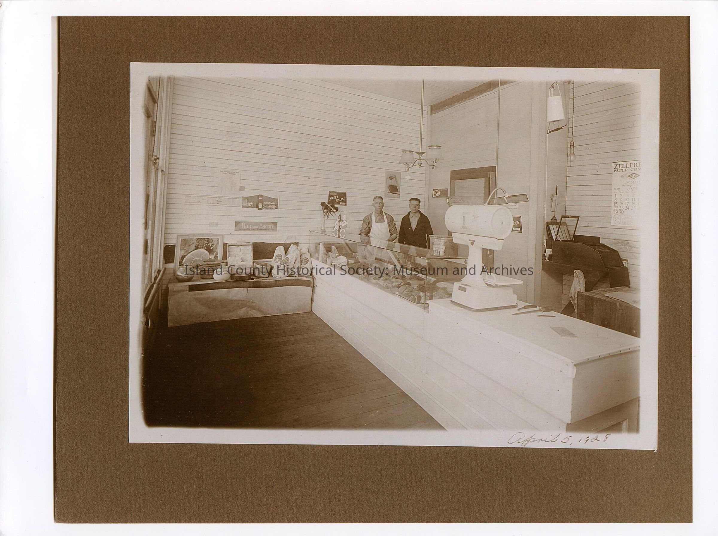 Photo of the interior of a store - meats, hams, scale etc.. Large window on the left. Tall ceiling with lights hanging down. Two men in the far corner behind the glass covered case. Another machine is on the right on a ledge below a calendar with April 1928 showing. Caption: April 5 1928. On the back April 5, 1928. Willard Race White Market, Dick Willard co-owner. Stanley Willard - son. Old location. Carbide light, hole with tank that held carbide, twine, fake ham for Easter. Leone Argent.