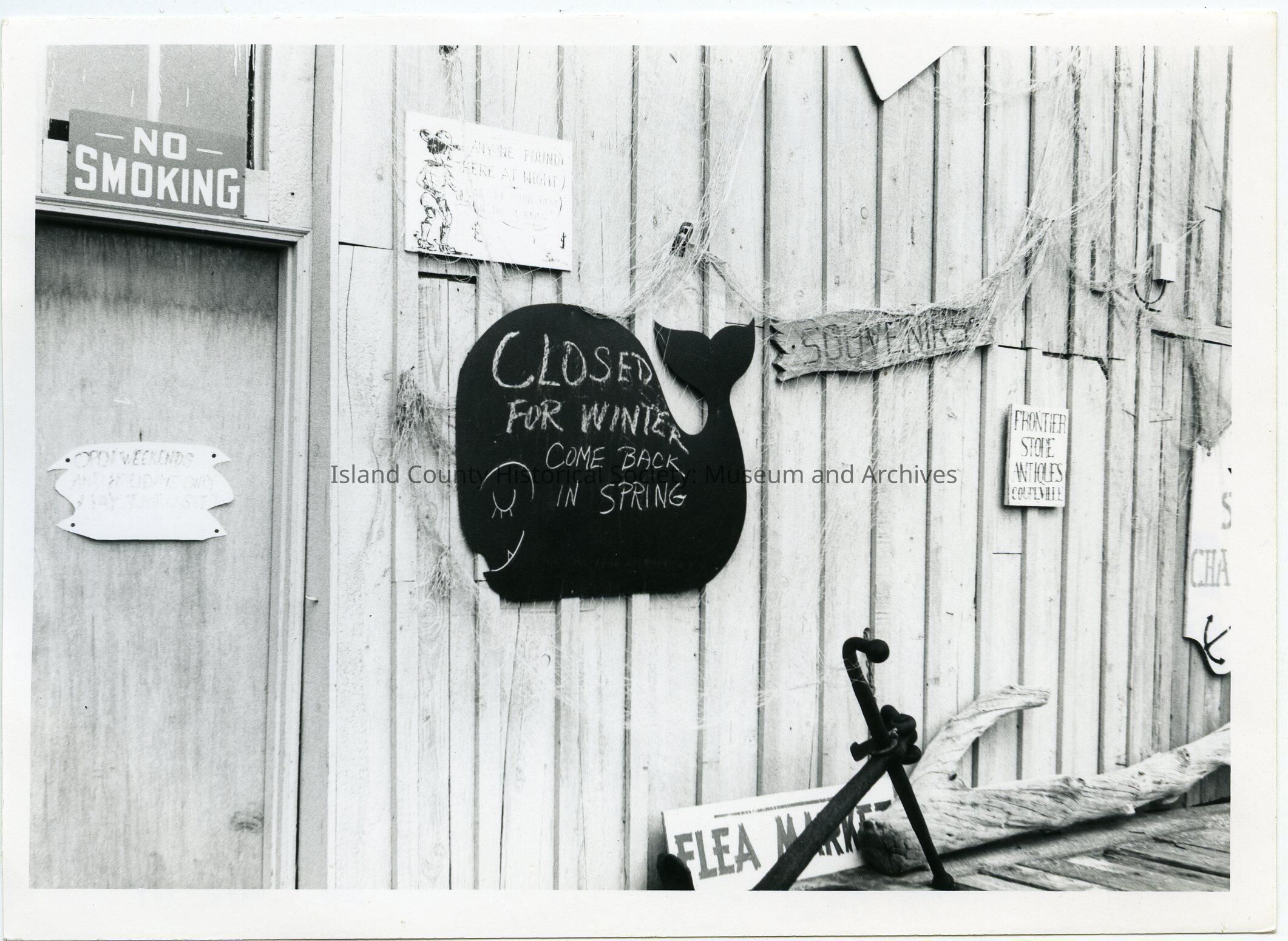 Photo of the building at 22 NW Front Street. Only part of the front is in the phot. The door on th eleft, various signs, large driftwood, part of an anchor. One shaped like a large whale: Closed for winter come back in spring. Frontier Store Antiques Coupevile. Flea market.