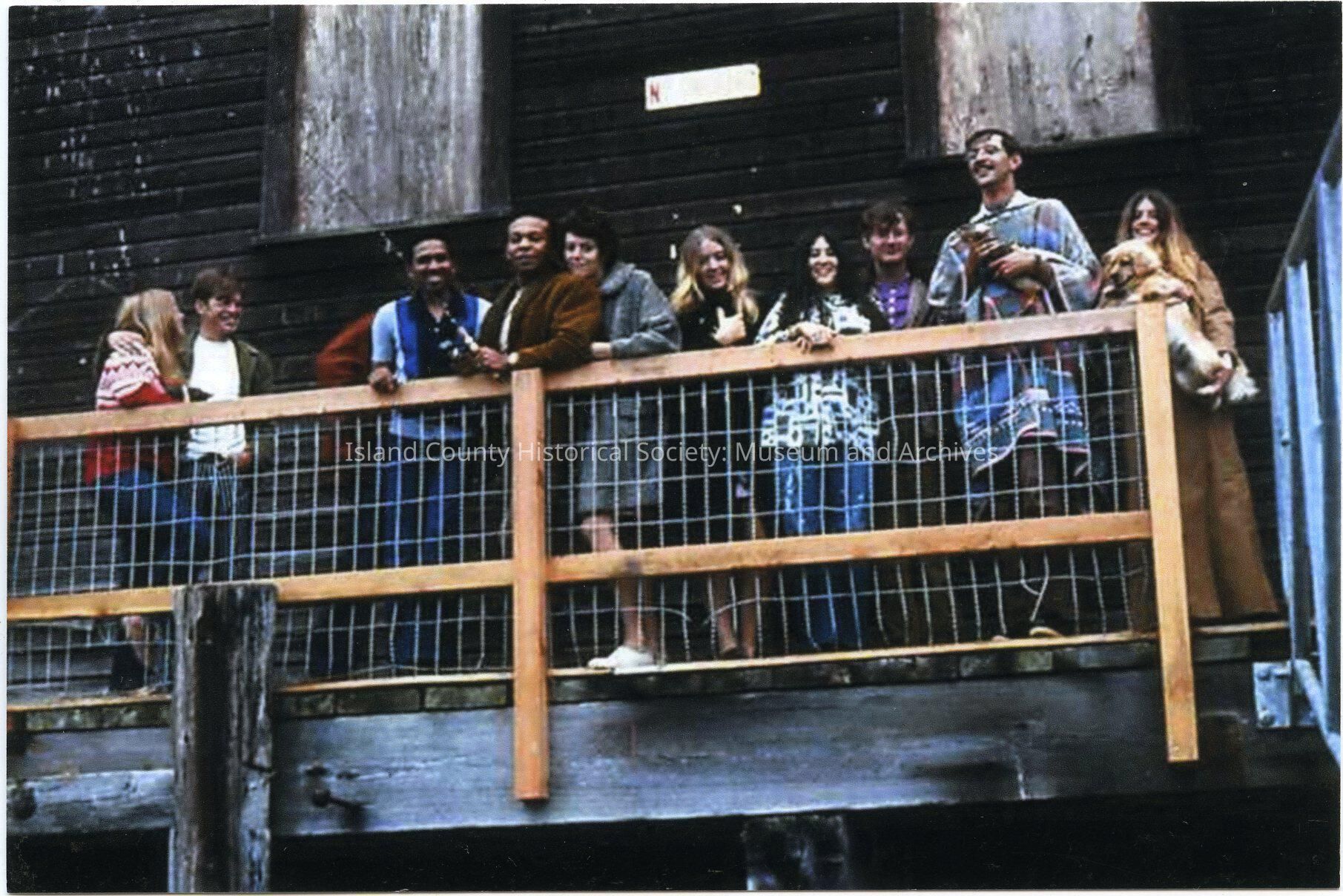One smaller and one larger photos of a group of people and two dogs, standing on the side of Trader's Wharf and leaning on the railing. One man is holding a fishing pole.