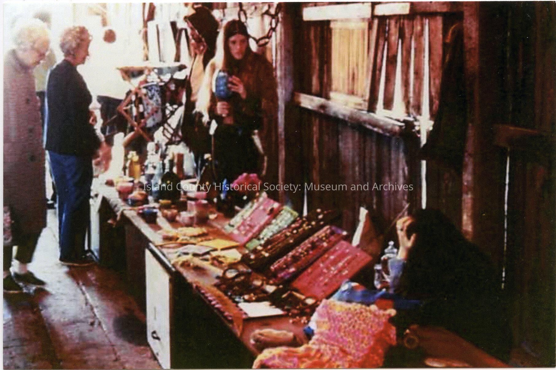 One smaller and one larger photos of the interior of a building. Three people are on the wall side behind a set of tables displaying wool and jewelry items. Other people are looking at the items.