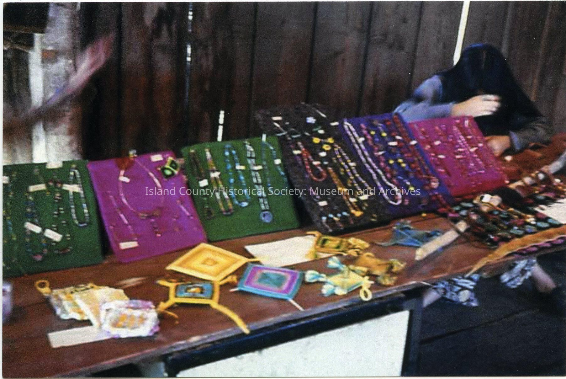 One smaller and one larger photos of the interior of a building. A person, with head down, is sitting on the wall side behind a set of tables displaying wool and jewelry items. On the left is probably the blurred arm of another person.