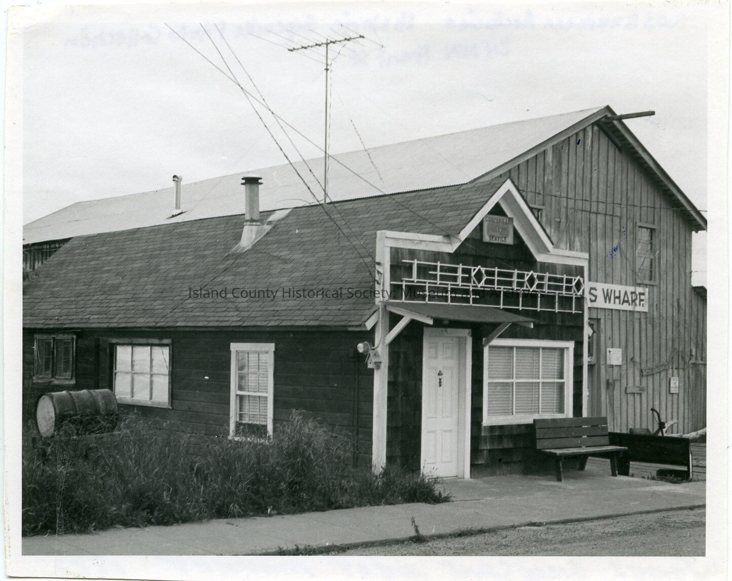 Photo of a building at 24 NW Front Street. It is a small, one story building with door on the left and wide window on the right; three windows along the side, a metal chimney, front door cover, bench under the front window, barrel on the left, and metal design with three diamond shapes along the front. Sign at the roof peak: Coupeville Service. On the back: page 94 1 of 4, 125A, Gillespie Meat Market, 1887, James Gillespie meat market 1887, photo 1971