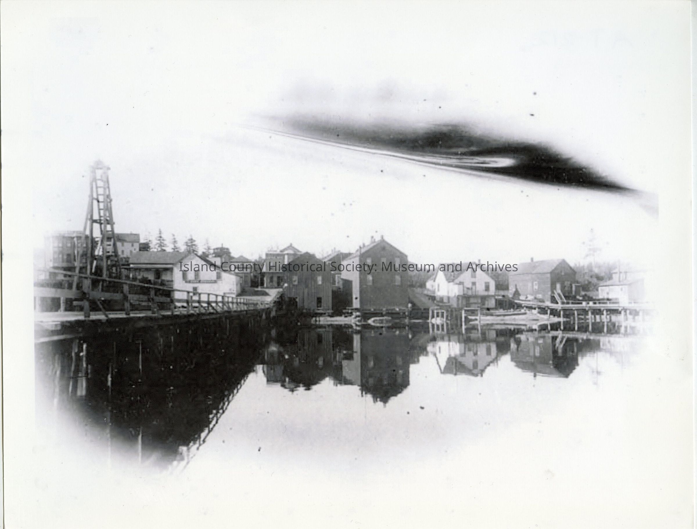 Photo of Front Street from probably Roberston's Wharf, now gone. On the left is a ladder tower on the pier, in the background is the Glenwood Hotel, Puget Sound Academy. In the middle is the Central Hotel (now gone). On the right of the pier, four buildings including Kingfisher, Gillespie Livery and a house now on Coveland Street across from the Post Office. On the far right is the Starwana Hotel (then Blockhouse Inn, which burned; now the site of the ICHS museum) and the pier leading to the wharf.