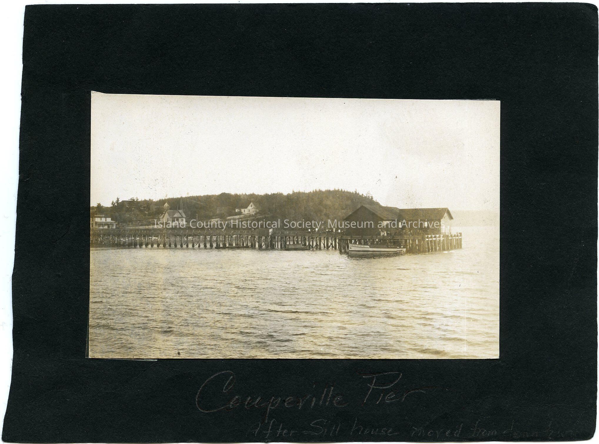 Photo of the wharf in Coupeville, which is still standing. Two boats and a canoe are tied up. On the left is the Starwana Hotel. Caption: Coupeville Pier, after Sill house moved from down town.