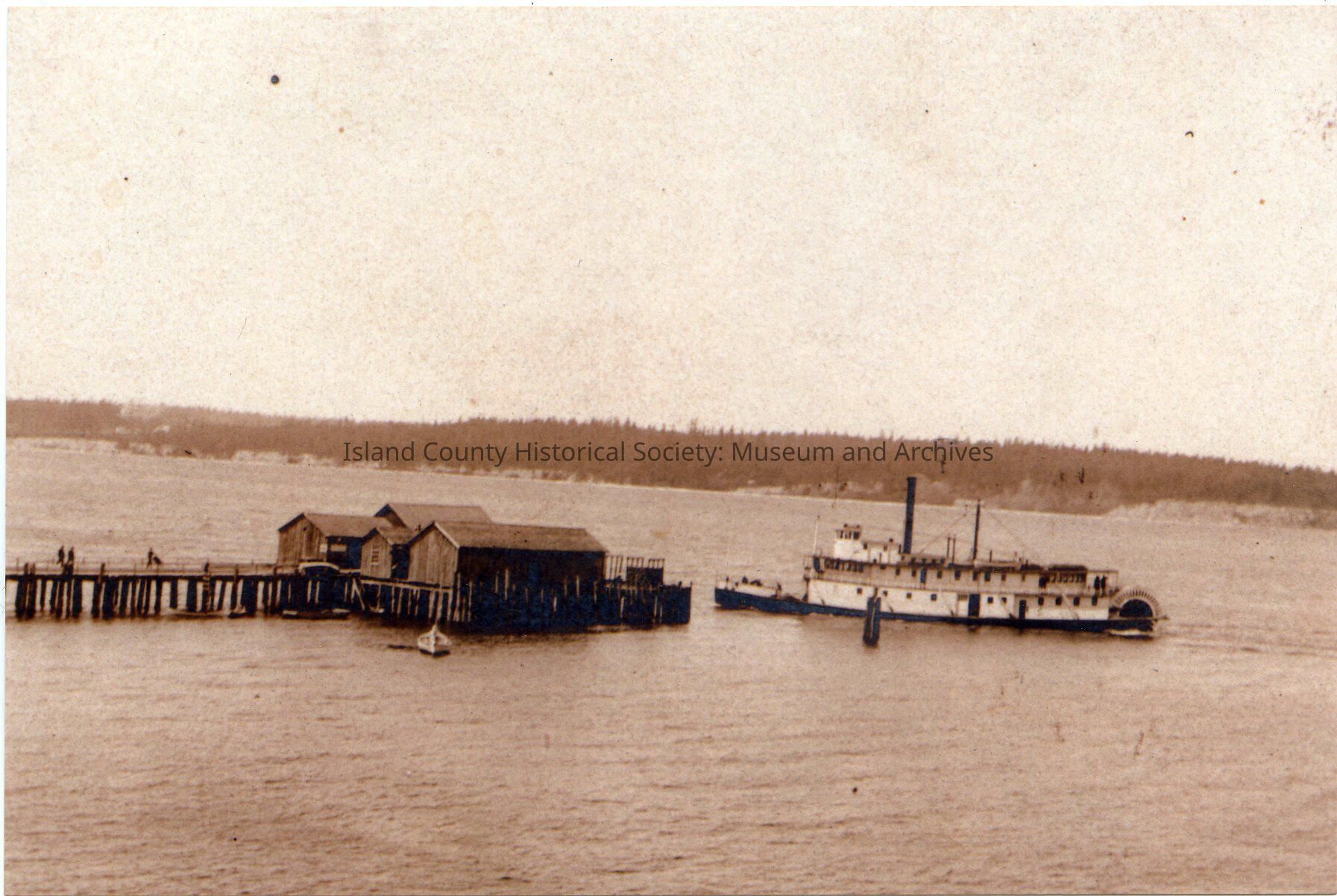 Photo of the Roberstons wharf in Coupeville, now gone. There are several large buildings on the wharf. A small boat is on foreground of the pier. A large steamer ferry is tied up at the wharf. People are walking along the pier and are on the ferry.