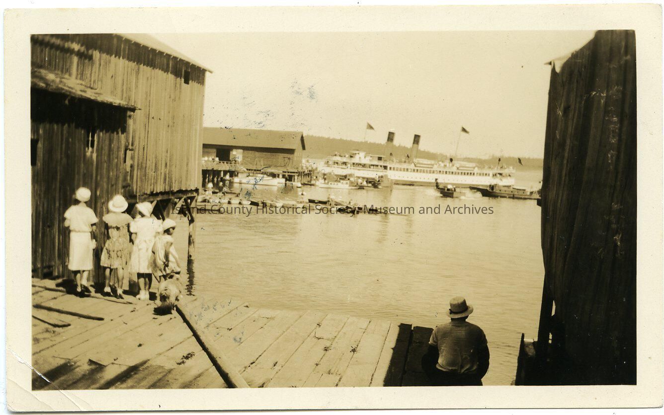 Photo of a woman and three girls in foreground looking at a steamer ship at the Coupeville Dock. They are standing to the right of the livery stable. A number of other boats are tied up or anchored in the area. A man is in the foreground watching the boats. On the back: Aug 1935