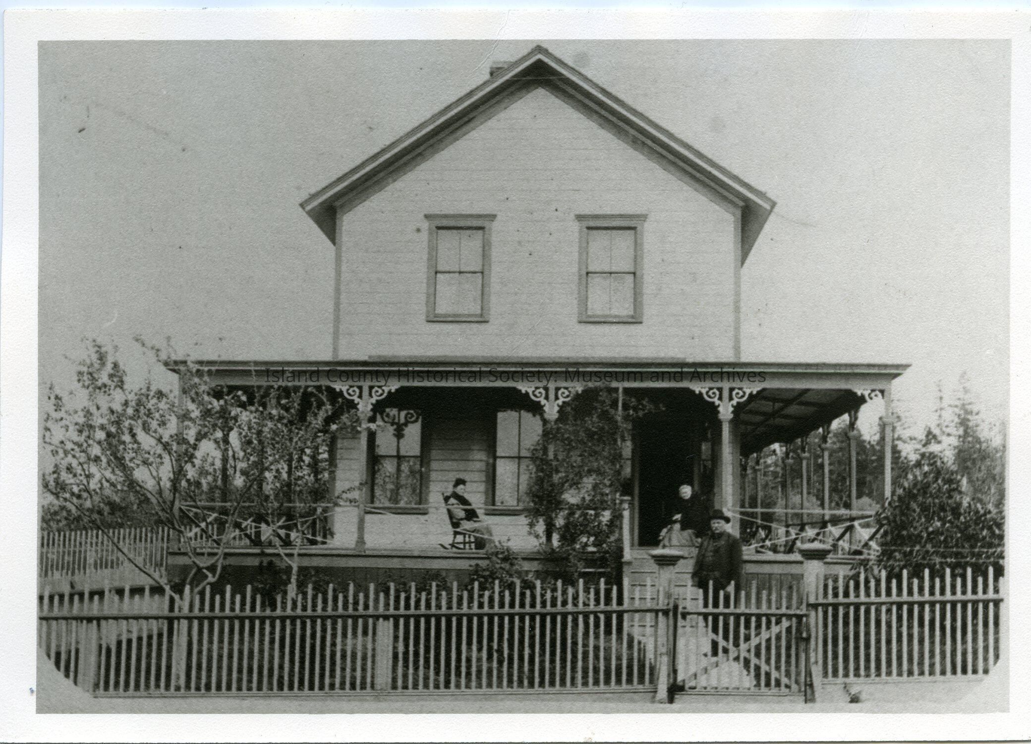 Photo of a two-story house with a porch on at least three sides. Two windows on top floor. Two windows beside door on porch. Man standing on sidewalk. Two women seated, on in a rocking chair, on the porch. Probably metal picket fence in the front and around the sides. On the back: Eaton home. Where Whidbey Island Bank now stands. Torn down in 1960. Charlie Eaton. Mrs. Scott, Mrs. Eaton's mother. Mrs. Eaton.