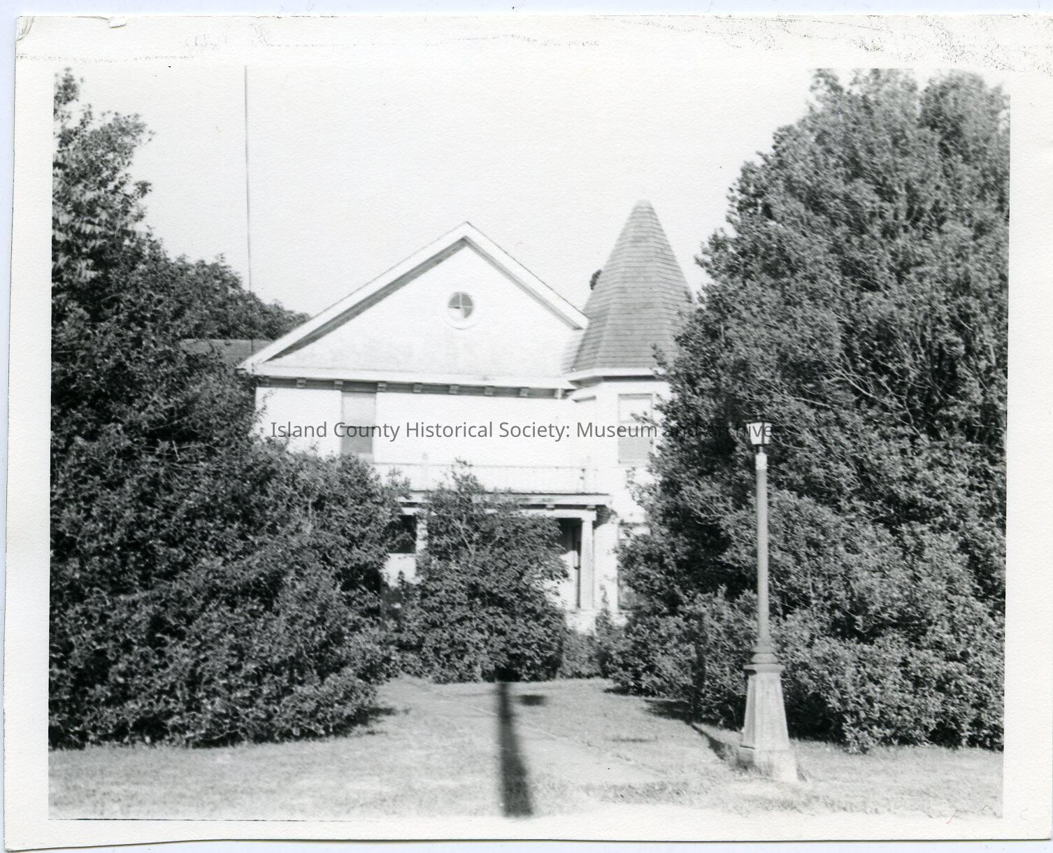 Photo of a two-story house with a turret on the right, round window at the roof peak, covered porch. Light pole on the right. Sidewalk to the front door. Trees and bushes obscure the rest of the house. On the back: Hill Harmon, Ralph Engle home 1858, photo taken 1971, p76