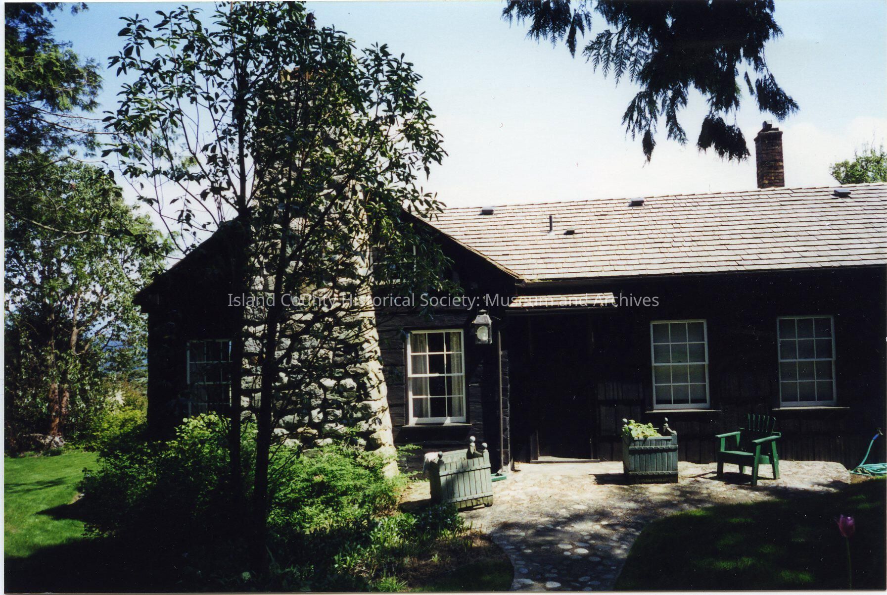 PNRO page 170: built in 1859, additions 1928; originally on a site north of Penn Cove. Maude Fullington bought it, Fred Krueger dismantled it, numbered each log, reassembled at new site. Mary Fullington planned design. Chief Charlie Snakelum and Aleck split over 400 cedar shakes for interior walls. 1956 moved to present locaton higher on the bluff and additions made. 1983 new shingles.