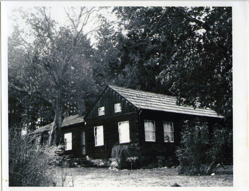 PNRO page 170: built in 1859, additions 1928; originally on a site north of Penn Cove. Maude Fullington bought it, Fred Krueger dismantled it, numbered each log, reassembled at new site. Mary Fullington planned design. Chief Charlie Snakelum and Aleck split over 400 cedar shakes for interior walls. 1956 moved to present locaton higher on the bluff and additions made. 1983 new shingles.