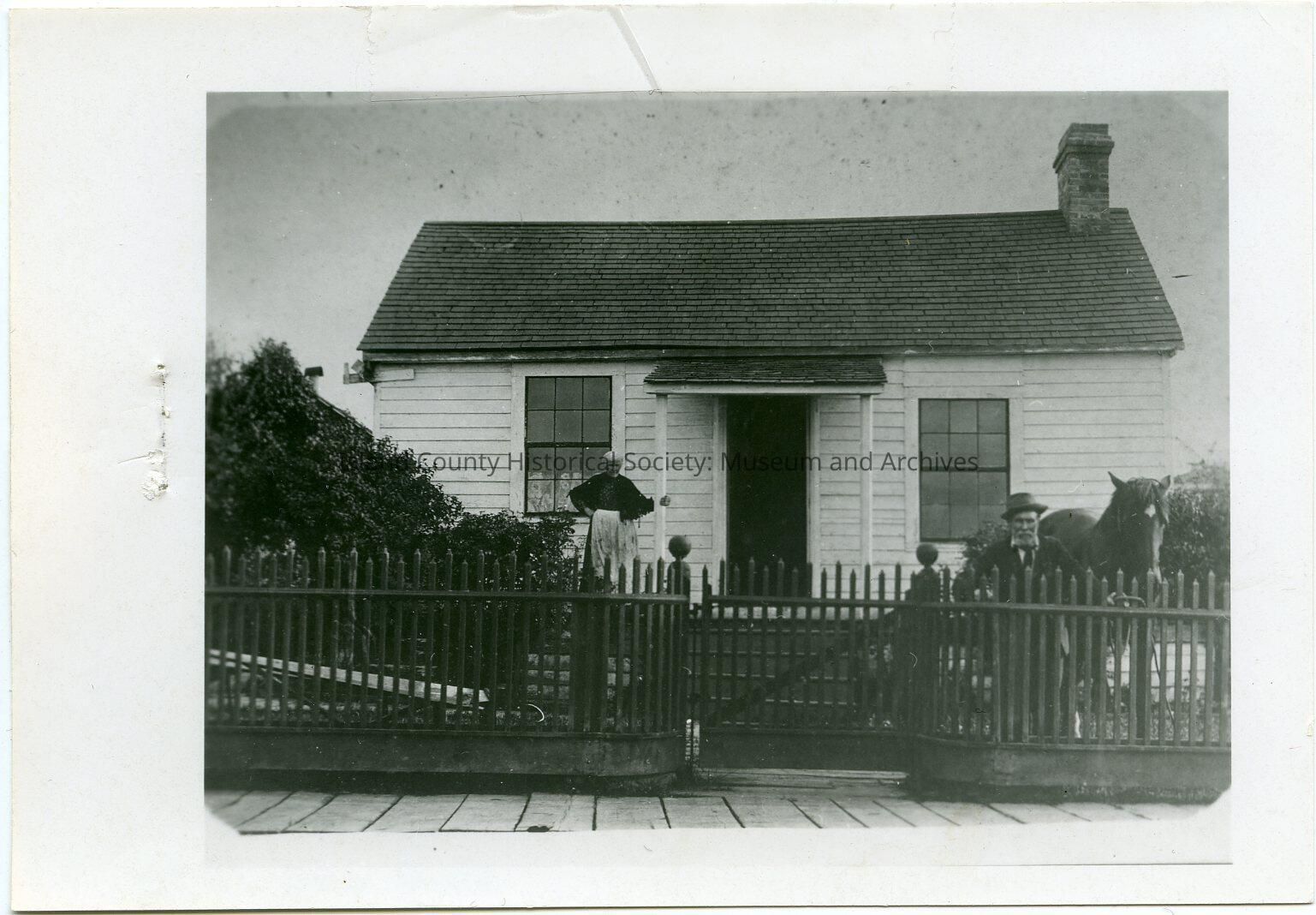 Photo of a one-story building with a chimney on the right, central door with portico, two window. A woman is on the porch with her left hand on a pillar. man with a hat is standing inside the metal picket fence and holding the reins of a horse. Wood plank sidewalk. On the negative sleeve: Mr. and Mrs. Waterworth