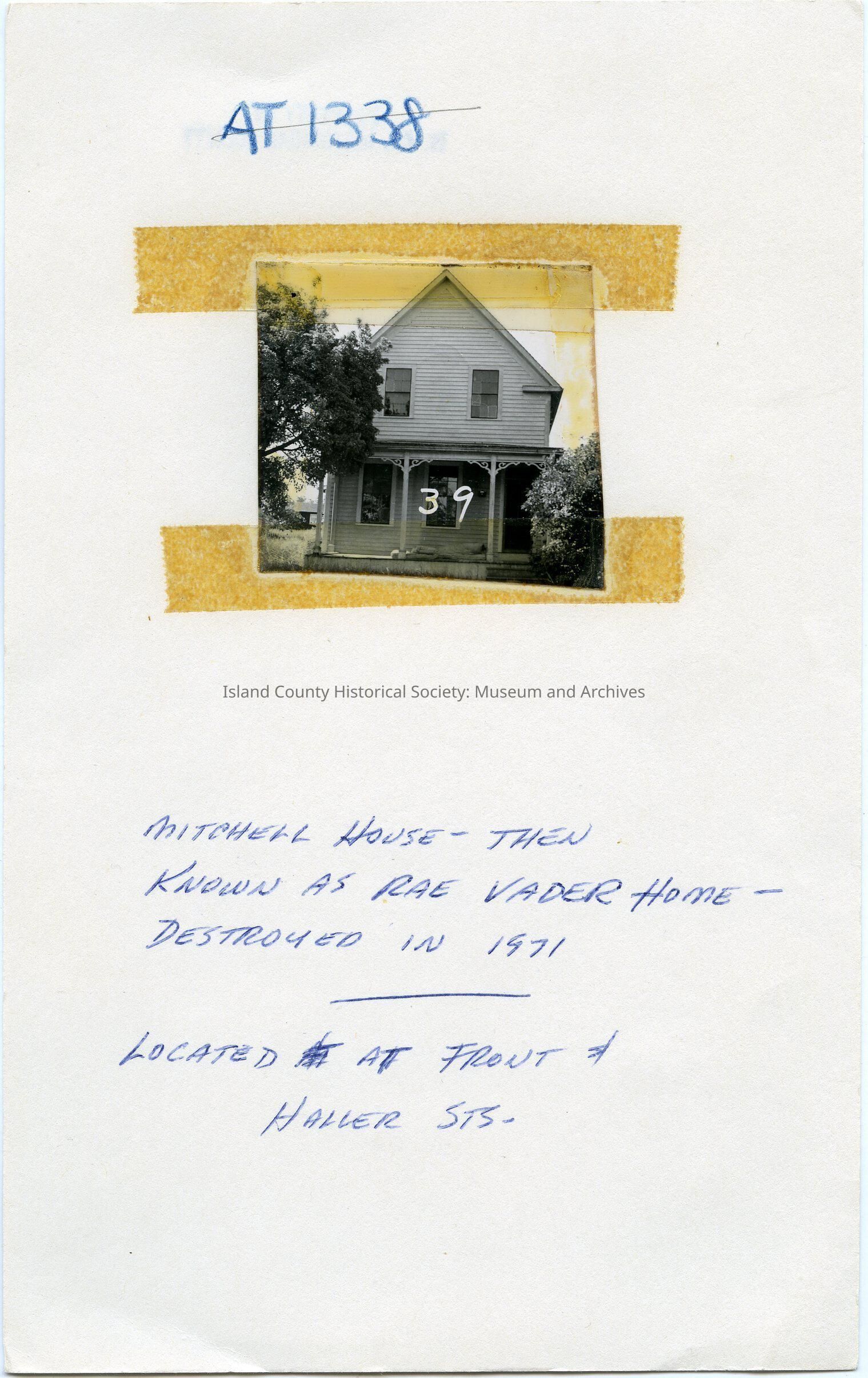 From a paper which the photo had been taped to: AT 1338. Mitchell house - then known as Rae Vader home - destroyed in 1971. Located at Front and Haller Sts.