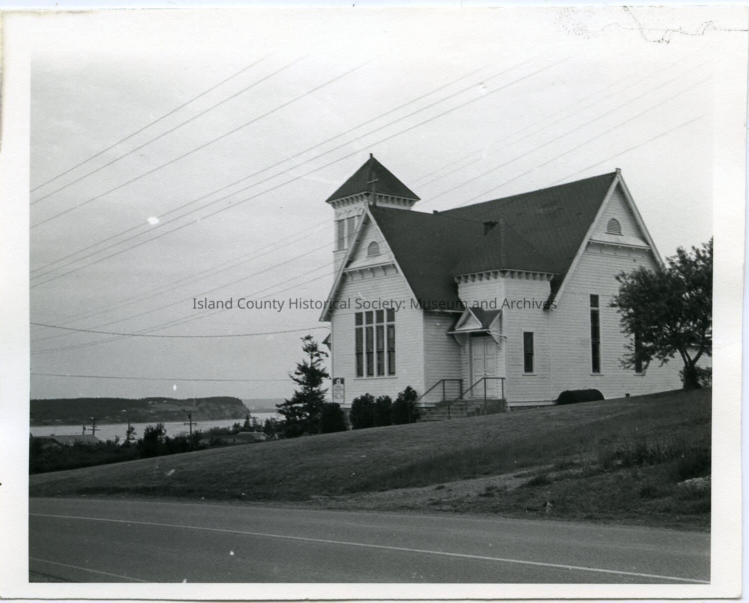 Photo of a church with a set of four narrow tall windows on the front, short steeple on the left - no spire on the top. Wood with stone foundation. Bell in the top of the steeple. Asphalt roof. Road in front is paved; view of Penn Cove in the background. Sticky note: Congregational Church (1889) 1971 photo. Written on the back: Congregational Church 1889 taken 1971