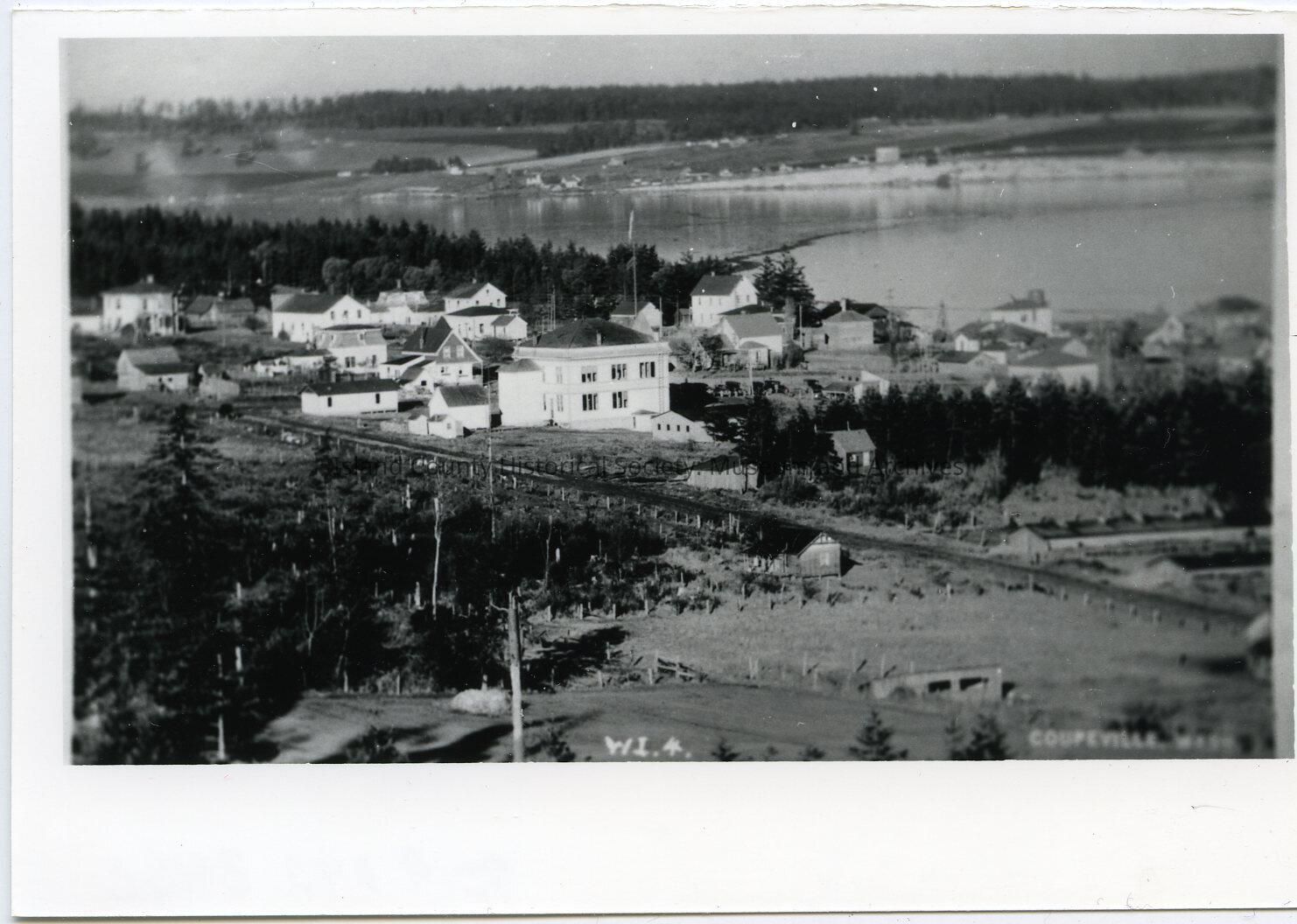 Photo of a view of Coupeville wtih Penn Cove in the background. The view is facing north and slightly west. Probably the courthouse is in the center. Dirt roads. Water tower near the cove. Caption: WI.4. Couepville, Wash.