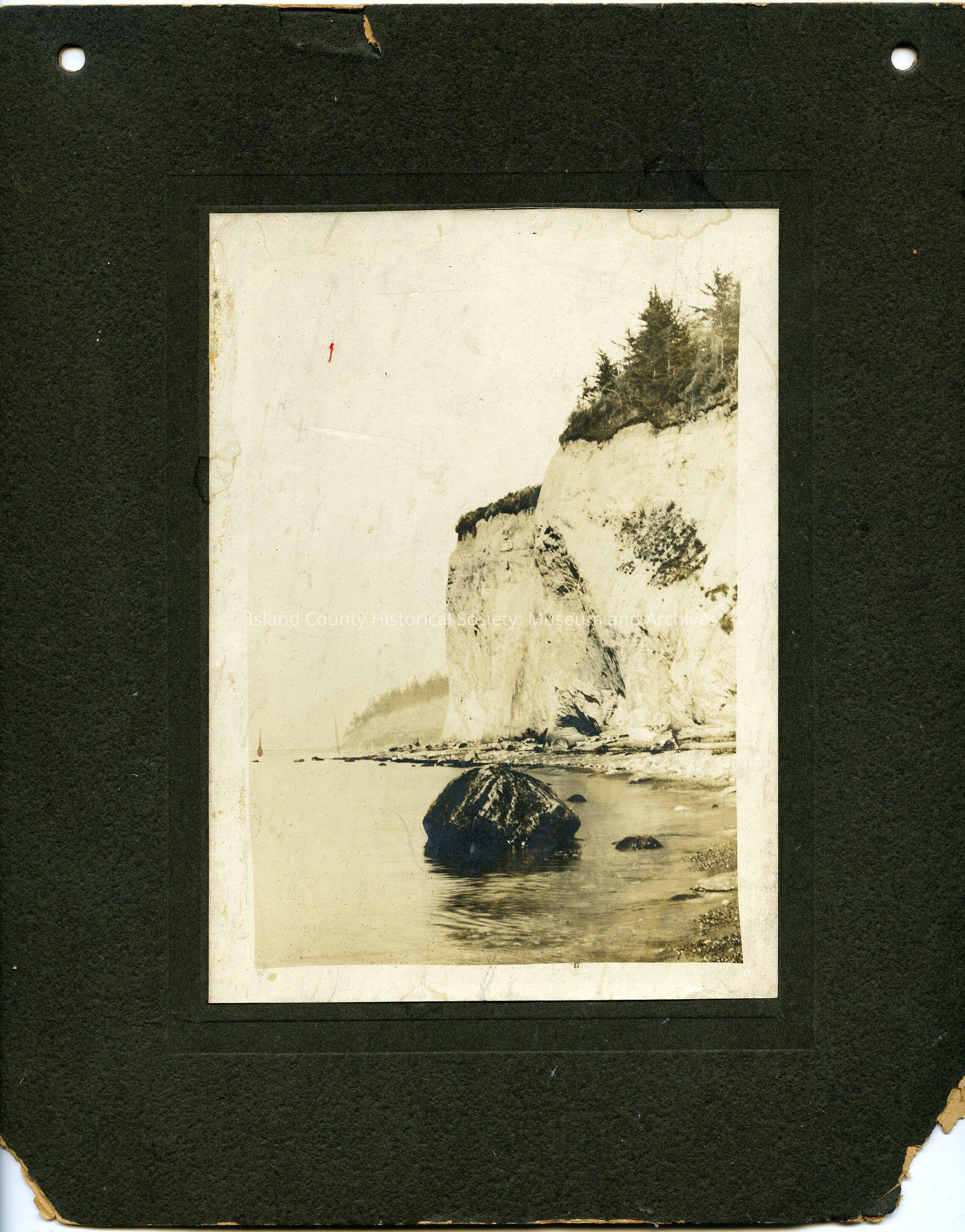 Photo (mounted) of a bluff with a big rock in the water in the foreground. This could be looking back towards Ebey's Landing. From folder: Coupeville, Views, General