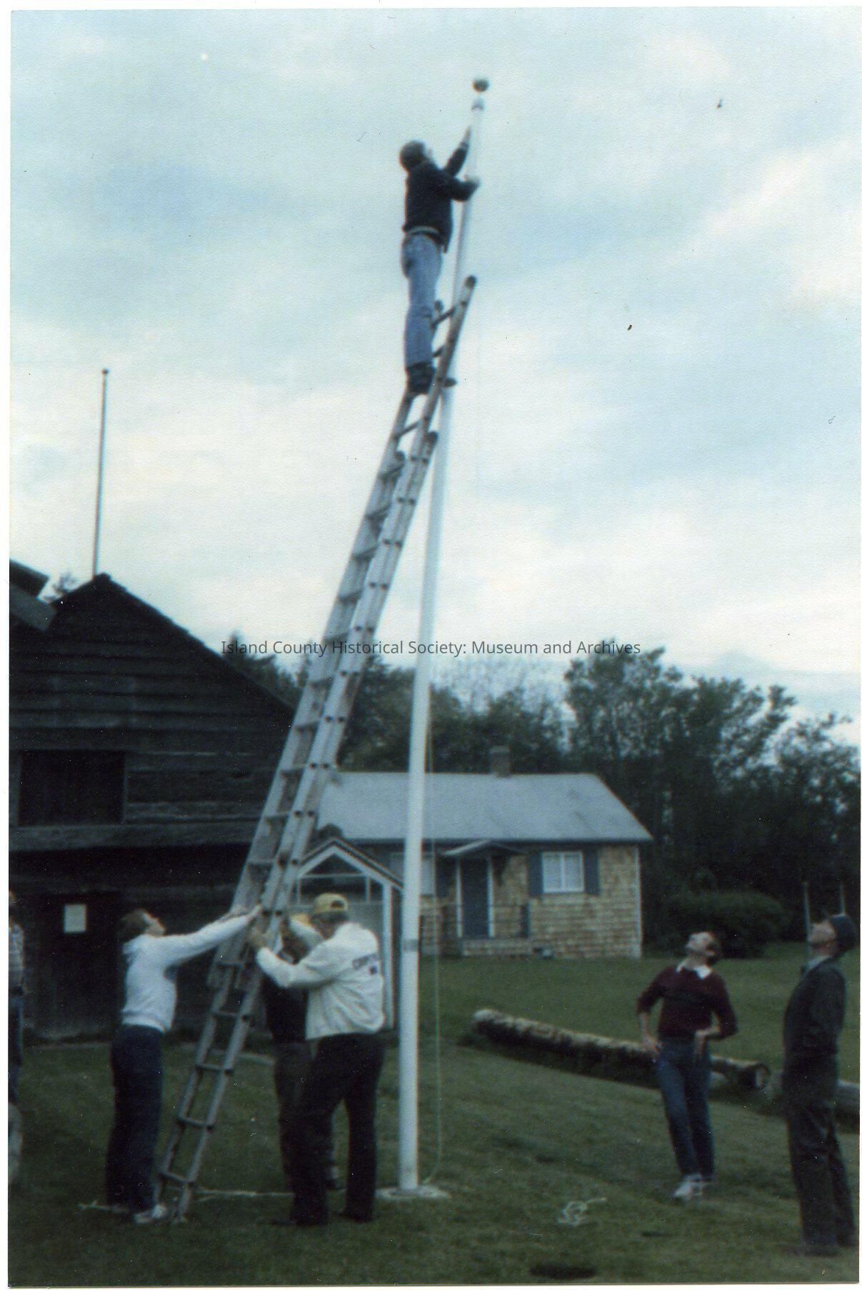Photo of a three people holding an extension ladder against the flagpole in front of a blockhouse (possibly the Alexander blockhouse). Two people are looking up at the person at the top of the ladder doing something (out of view) at the top of the pole. On the back: Erection of flag pole. Ron VanDyk on top. Val Arnold holding ladder. Mike Putnam on right.