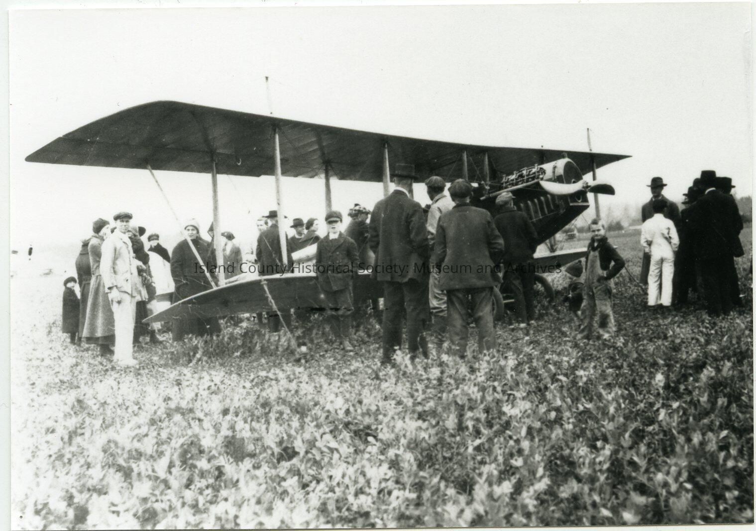 Photo of a group of people standing around a biplane. The plane is in a field. On the back of the photo:; From picture collection of the Daughters of Pioneers of Washington, ?? Farm, Whidbey Island, May 1919.