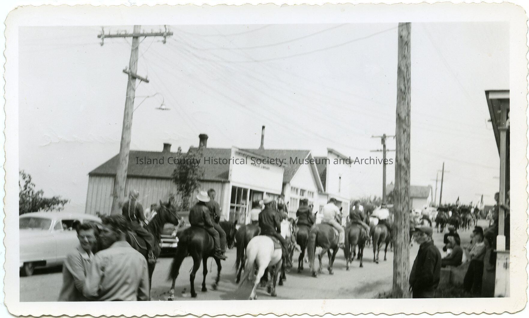 Photos of a parade going east on Front Street. Men and at least one woman on horseback. Going by the Public Library (now gone), what is now The Little Red Hen Aqua. Bystanders watching the parade. On the back: July 27, 1954 Sheriff's Posse parade Front Street, Coupeville.